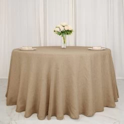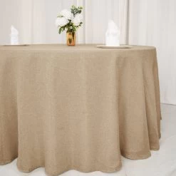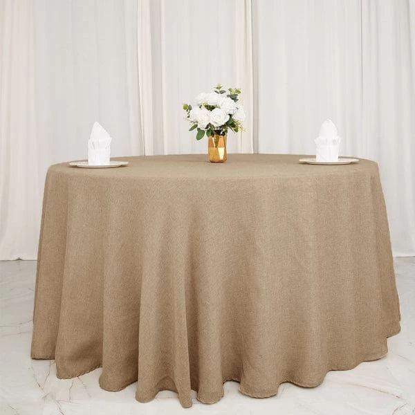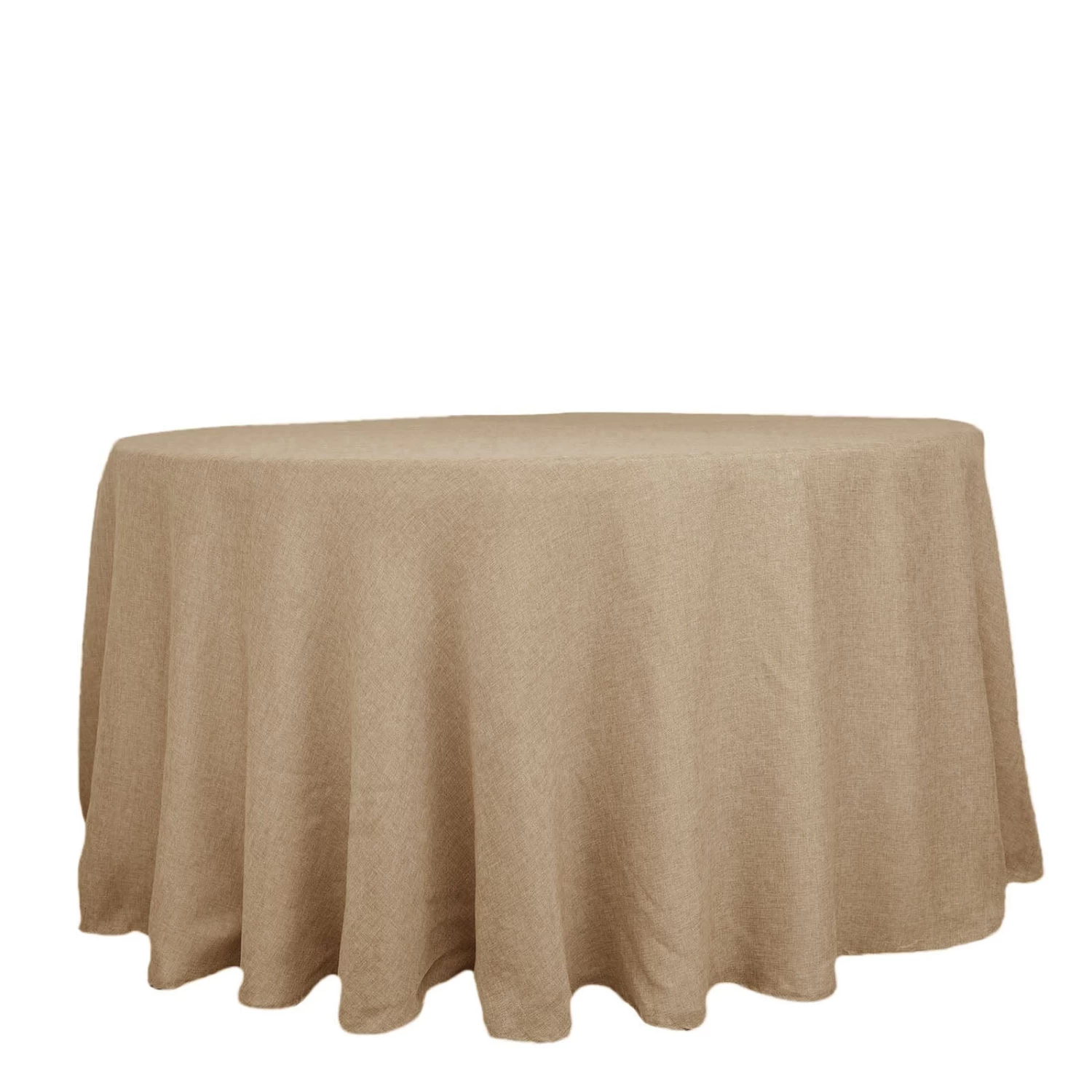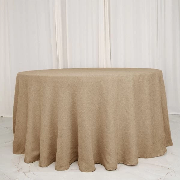 Crafted from a high quality faux burlap fabric with seamless design, this faux burlap round tablecloth will be a great addition to your table decorations. These tablecloths with unique texture will dress up your party tables with country charm and rustic chic. Perfect for small family dinners, get-together, outdoor weddings, parties, events and any special occasions.