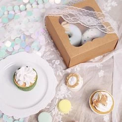 These stylish cake boxes are great for gifting your sweets and bakery goodies. The top features a clear plastic window that makes it easy to see the contents of the box. Just perfect to highlight your cakes, cupcakes, muffins, cookies or any of your baked creations. Made with solid and plain cardboard, you can easily customize this cake box with markers, ribbons and thoughtful stickers or messages. Use these cupcake boxes to present your baked treats as gifts or favors for your guests at parties, weddings, events and special occasions.