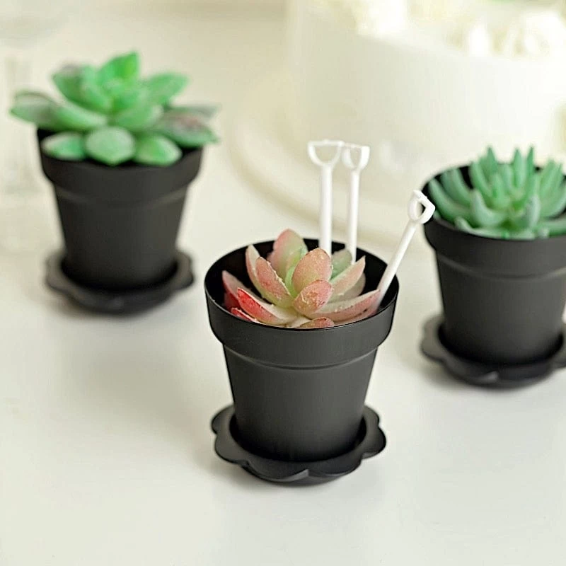 Entertainment just got easier. Serve your guests with delicious desserts using these individual plastic mini flower pot dessert cups. These cute flower pots are the ideal dessert holders for baby showers, birthday parties, weddings, graduations or any special events! Each flower pot is made from high-quality plastic with a small spoon, tray and a clear lid. Perfect for presenting your cake, cupcake, pudding, ice cream, mousse, muffins or any desserts you can think of. The possibilities are endless!