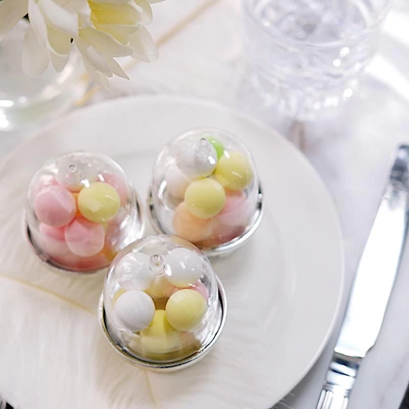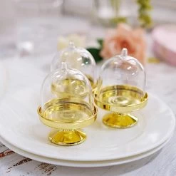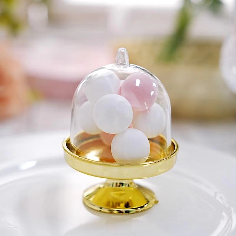 Entertainment just got easier. Serve your guests using these individual plastic mini cake stands and let your great food speak for itself! These cute cupcake stands are the ideal favor holders for baby showers, kid’s birthday parties, weddings, graduations or any special events! Each cake stand is made from high-quality plastic with an elegant metallic bell-shaped base and a clear dome. Perfect for presenting your small cakes, desserts, party favors, candies, chocolates, muffins or any gifts you can think of. Use them as decorative accents to bring a fun and festive atmosphere to your celebration. The possibilities are endless!