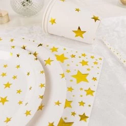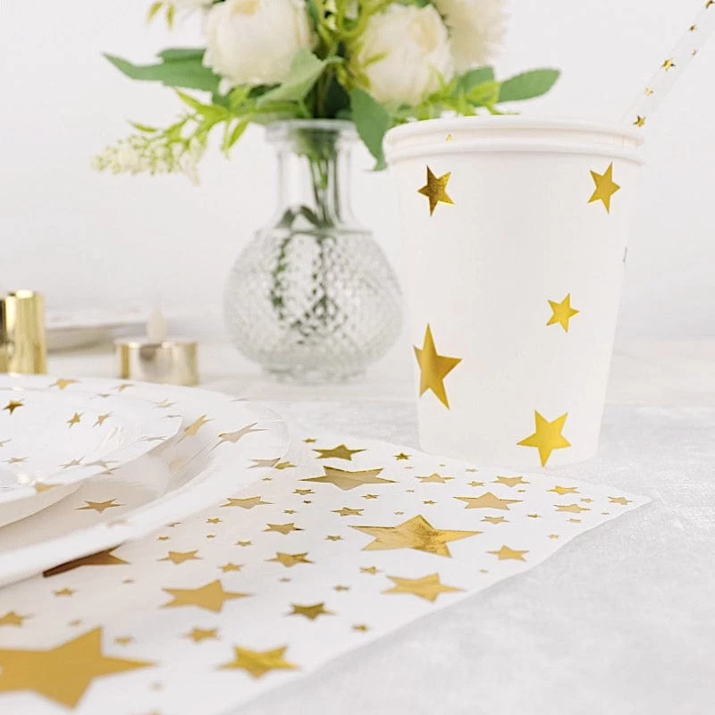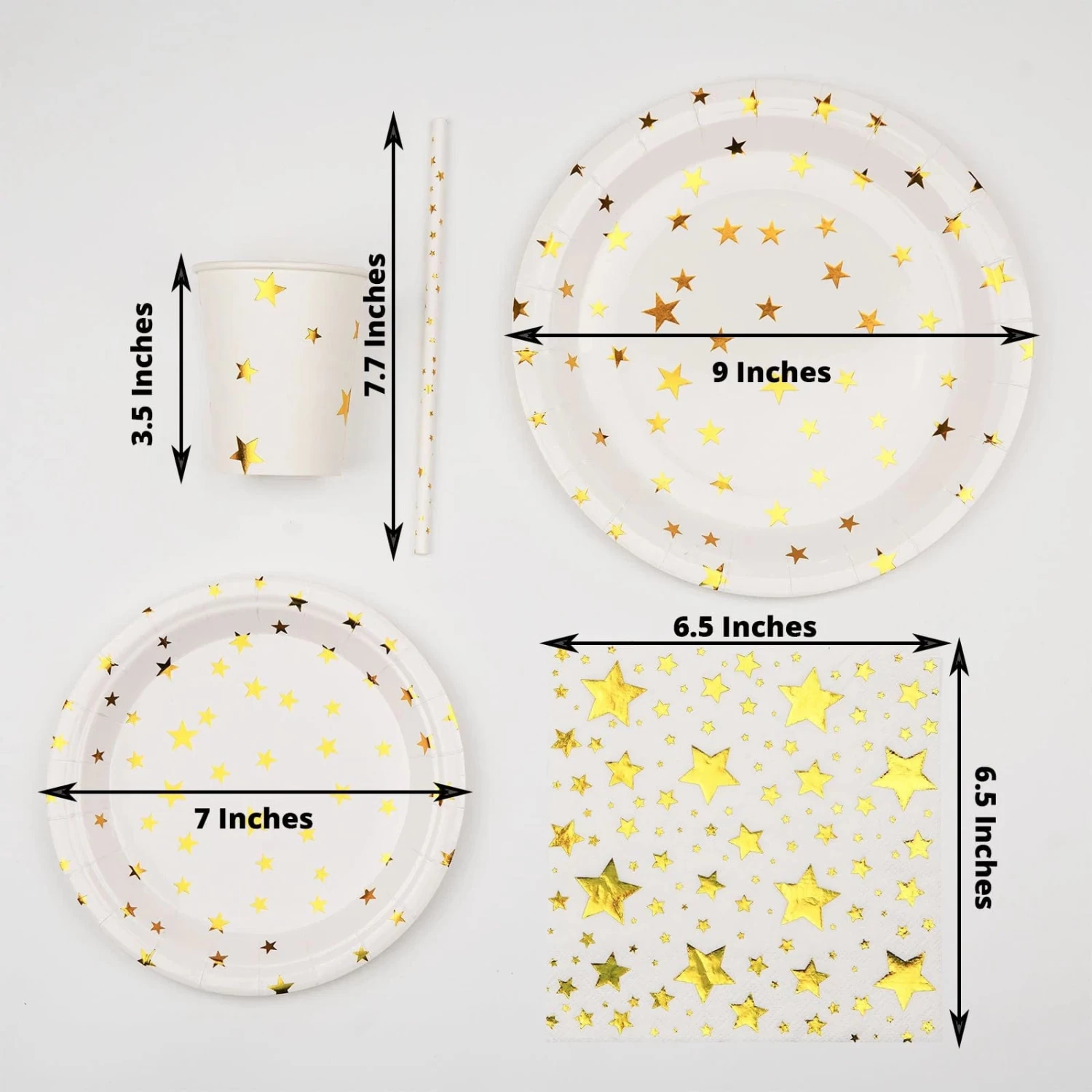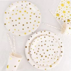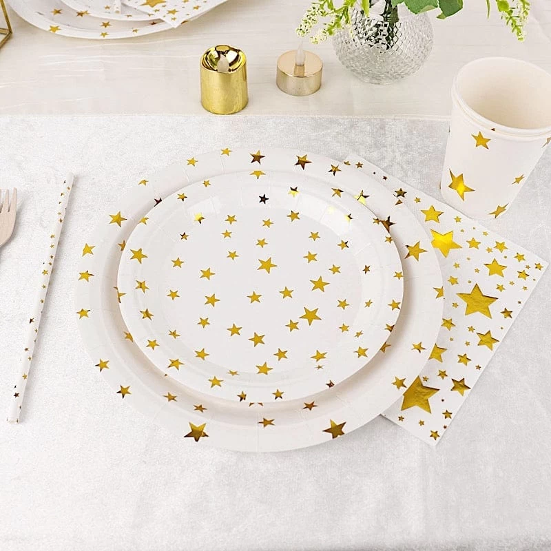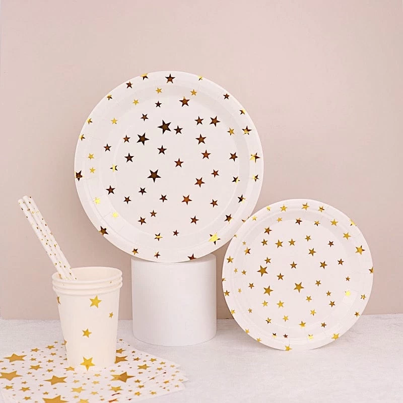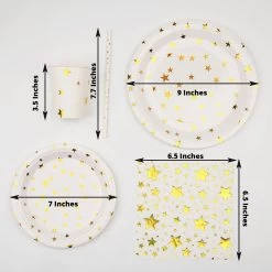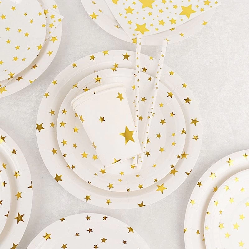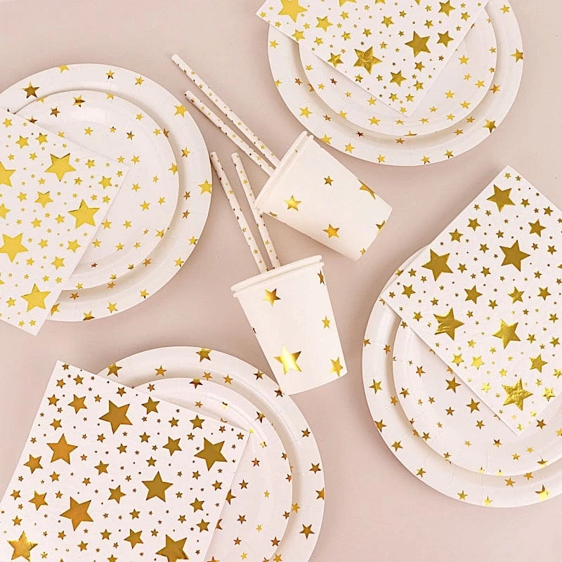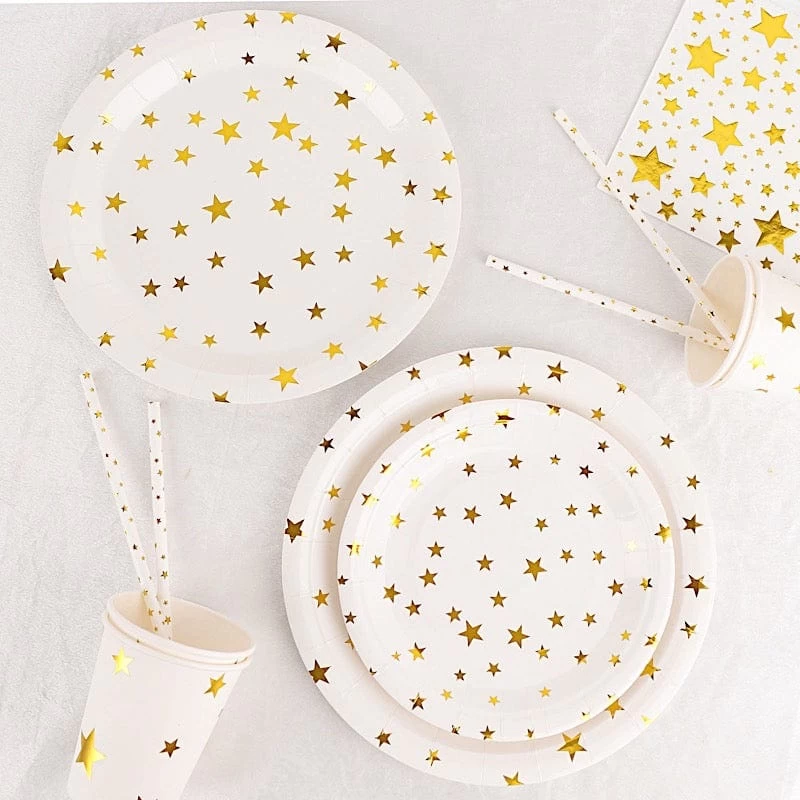 Entertainment just got easier. Serve your guests using this practical yet stylish paper tableware set and let your great food and beverages speak for themselves! High quality paper plates, cups, straws and napkins with sparkling printed stars will make any dinner or lunch look extraordinary. Great alternative for plastic dinnerware and a perfect choice for dining occasions where fast cleanup is a must! Use these disposable party supplies set for weddings, bridal showers, baby showers, birthday parties or any special events.