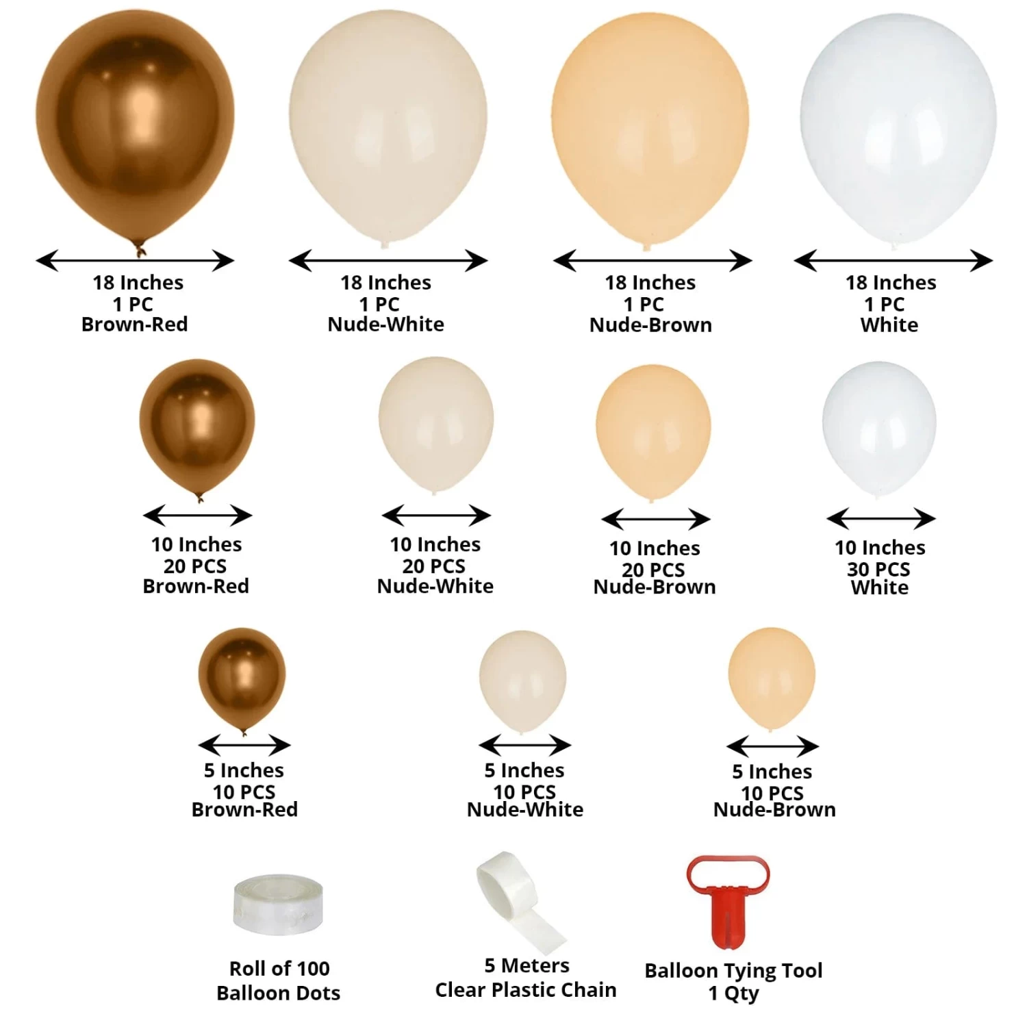 Total of 1 balloon tie, 100 balloon dots, and a 5m clear plastic chain.