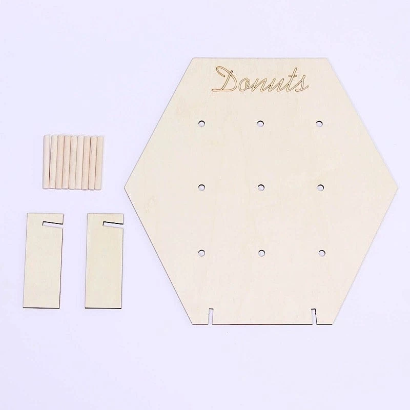This wooden donut wall display stand will look great on your dessert tables! Featuring poles sticks and a hexagonal board with a stylish engraved “Donuts” at the top, this easily assembled donut holder is a great addition to your party treats corner. Use this dessert stand to hold your donuts, bagels, pretzels or any delicious treats. This dessert holder is ideal for baby showers, kid’s birthday parties, weddings, events or any special gathering. The perfect way to delight your guests and allow them to serve themselves in style.
