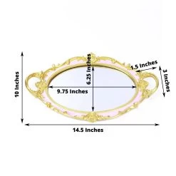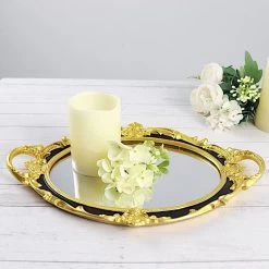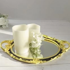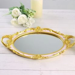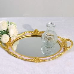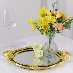Add an exquisite elegance to your party or home tablescape with mirror serving trays! This versatile oval serving tray features an eye-catching reflective mirror on a stylish metallic frame. Designed with convenient handles, this tray is perfect for serving your cocktails, wine, cake, desserts and more. Great to use as a base for your elegant candles and lovely flowers for an added decorative touch to your table centerpieces. This tray also makes a lovely gift for weddings, events, parties or any special occasions.
