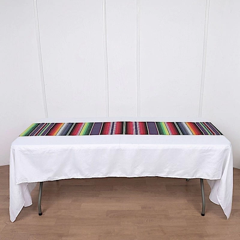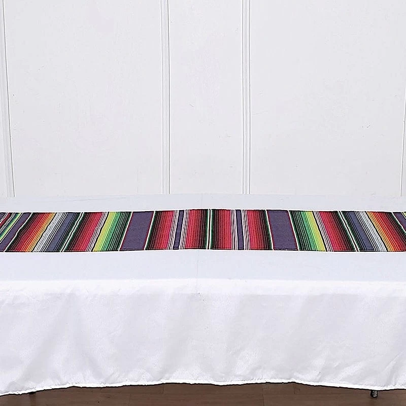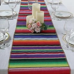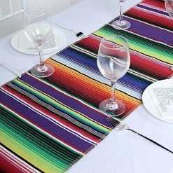 Add cheers to your party and accessorize your tables with this colorful Mexican Serape table runner. Blended cotton and polyester fabrics make this decorative dining table runner. The tribal Mexican stripes design with stylish handwoven tassels on two ends will bring a festive look to your table decorations. It is perfect for weddings, themed parties, fiestas, birthdays, picnics, outdoor events or simply for adding fun to your home decor.
