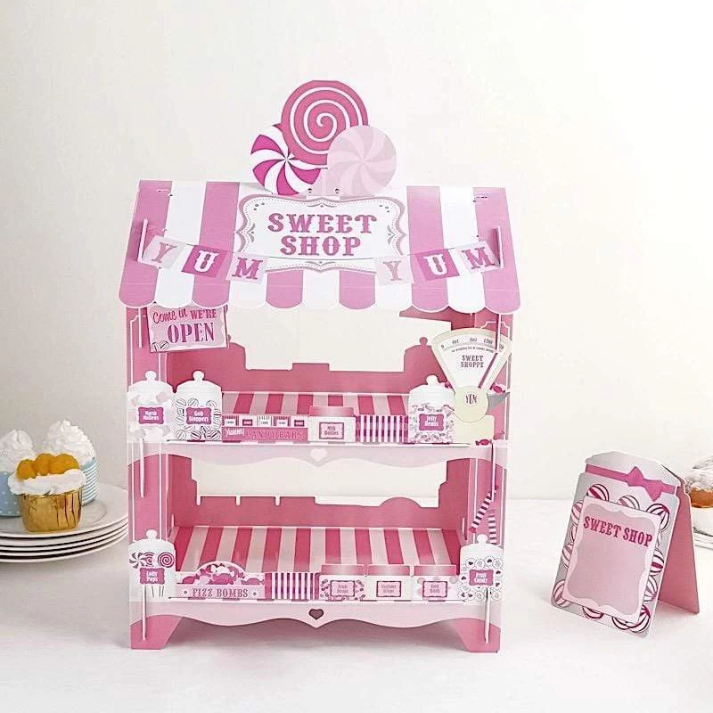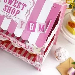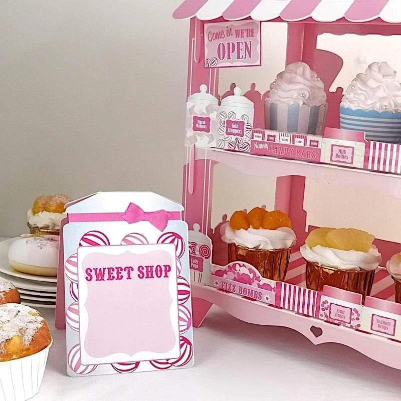 Celebrate your day with a decorative and functional sweet shop dessert stand! This sturdy sweet shop cardboard cupcake holder will help to serve your cupcakes, desserts and sweet treats with style and charm. Use the mini display stand to write your sweet messages, tags or any personalized notes. Just the perfect addition to your dessert tables! This cupcake stand is great for kid’s parties, birthdays, summer getaways, baby showers and events.