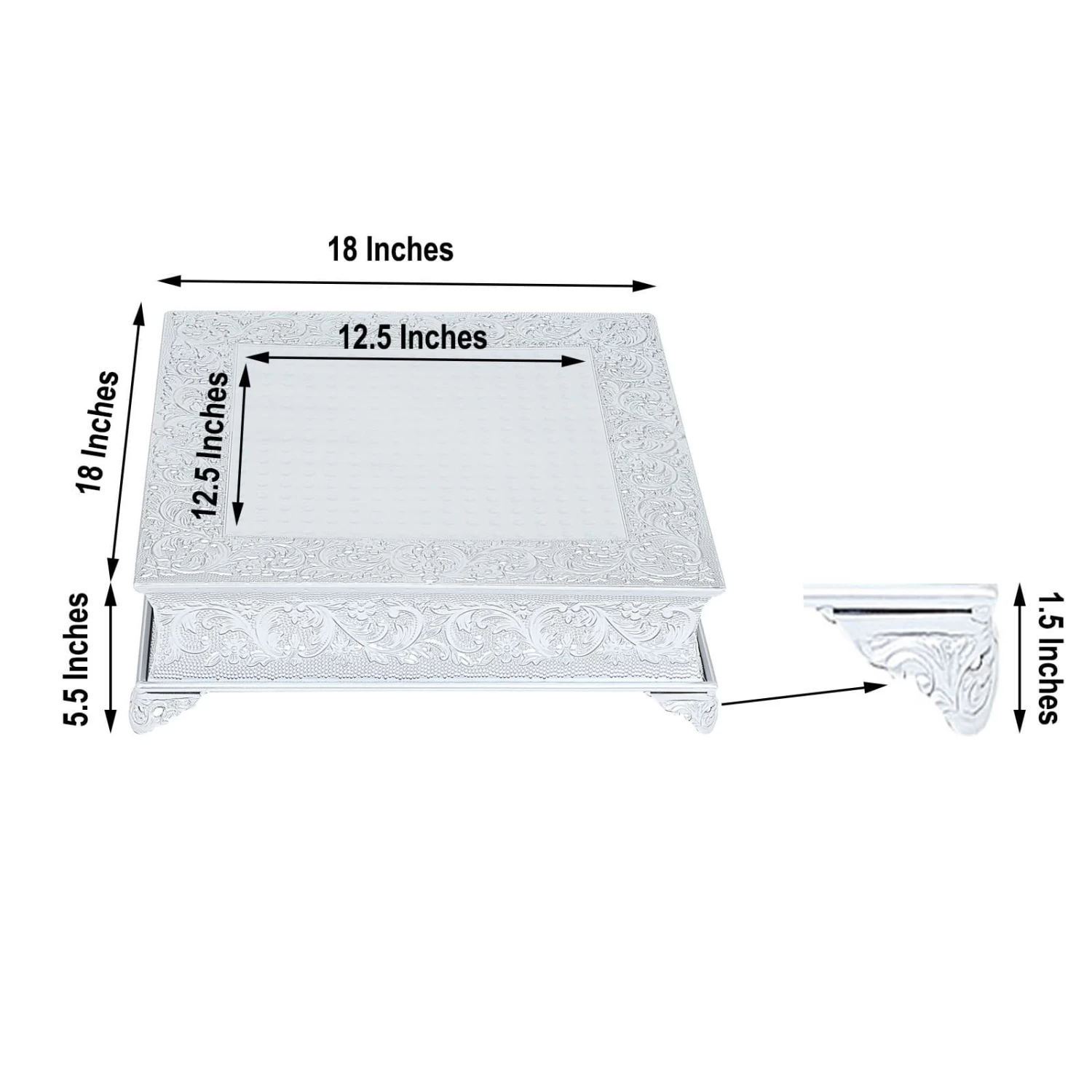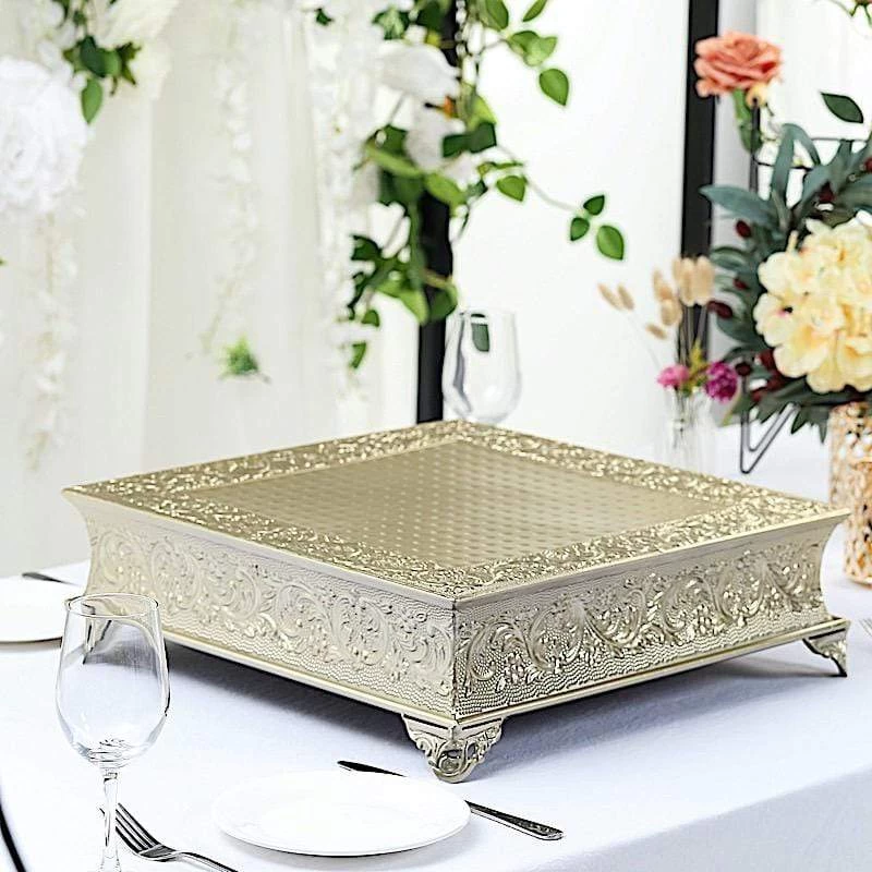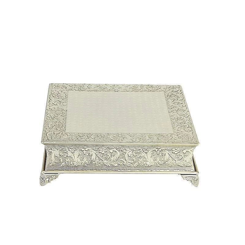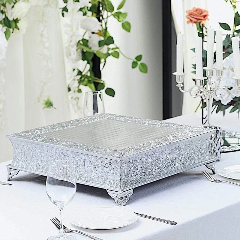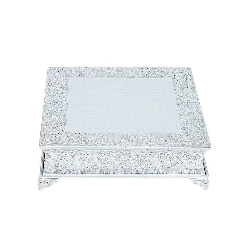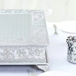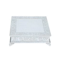 Display your desserts in style with this elegant cake stand. These square cake plateaus with side and top embossed designs will help to serve your sweet treats with outstanding elegance. Perfect for all occasion cakes, cupcakes or other goodies, this is just the cake stand you need to bring sparkle to your celebration!