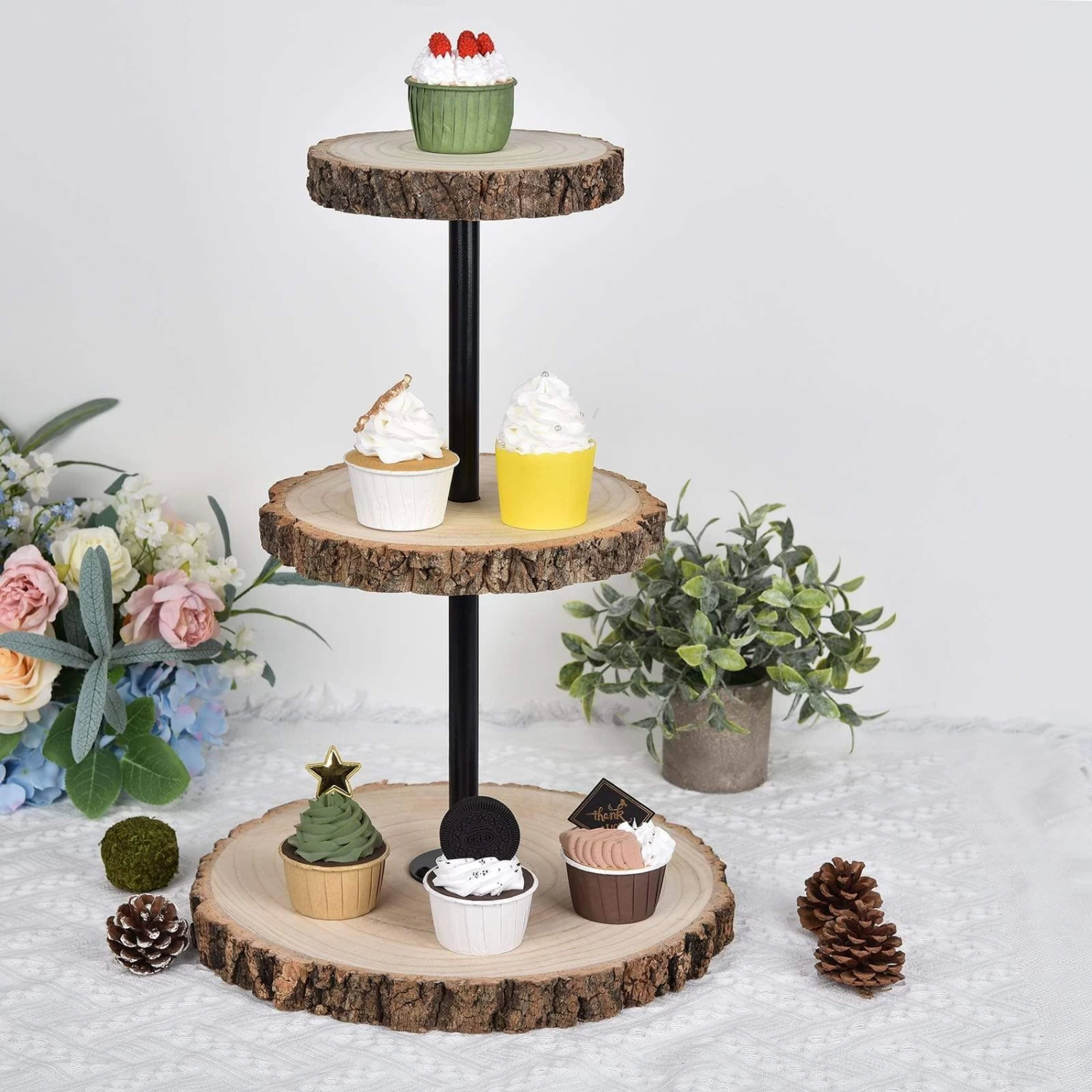 Celebrate your day with a dessert stand that is both decorative and functional! Slices of natural wood and high quality metal come together in this rustic dessert stand. Create a woodsy charm for your next party by placing it as a centerpiece with an elegant candlescape, floral arrangements and more. Place it on your dinner tables with your drinks, appetizers, cakes, desserts or any delicious food you can think of. The possibilities are endless! This wooden dessert display stand is great for weddings, rustic themed parties, events or your home. It is also a perfect gift for family and friends.
