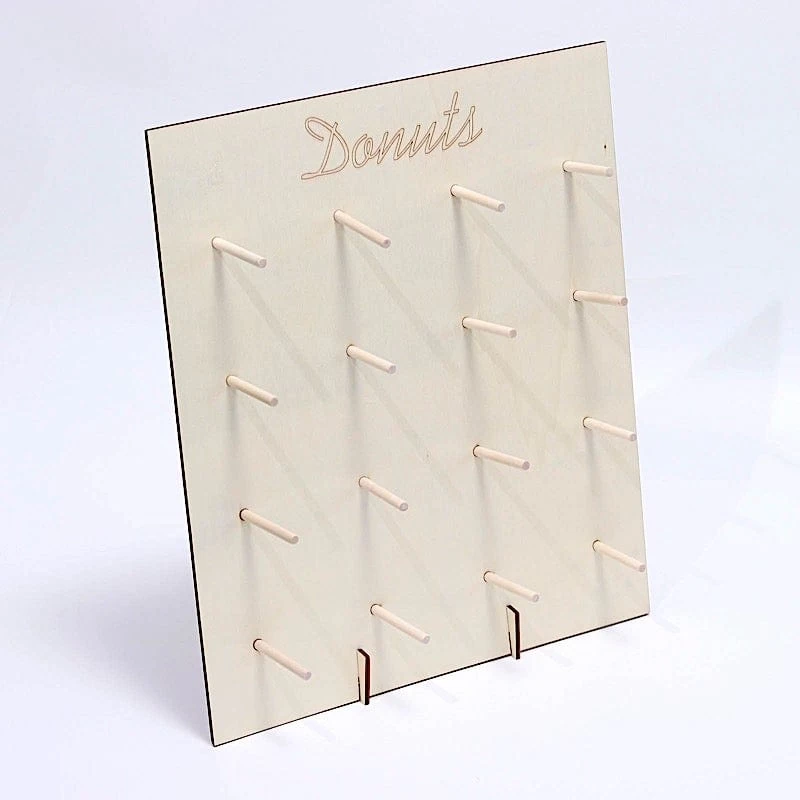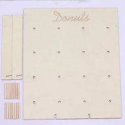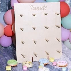 This wooden donut wall display stand will look great on your dessert tables! Featuring poles sticks and a rectangle board with a stylish engraved “Donuts” at the top, this easily assembled donut holder is a great addition to your party treats corner. Use this dessert stand to hold your donuts, bagels, pretzels or any delicious treats. This dessert holder is ideal for baby showers, kid’s birthday parties, weddings, events or any special gathering. The perfect way to delight your guests and allow them to serve themselves in style.