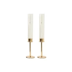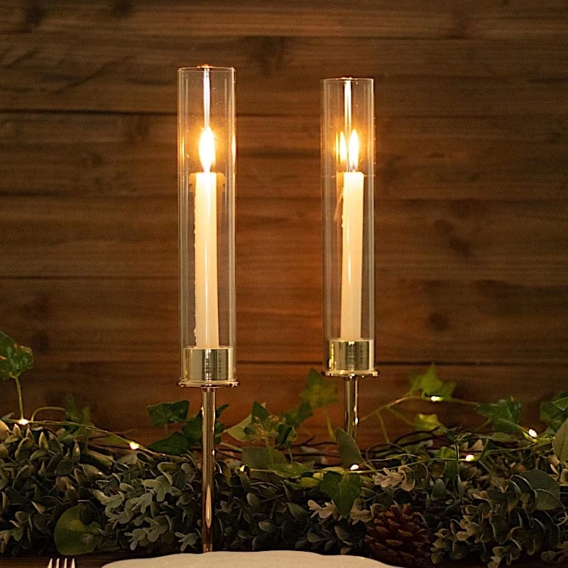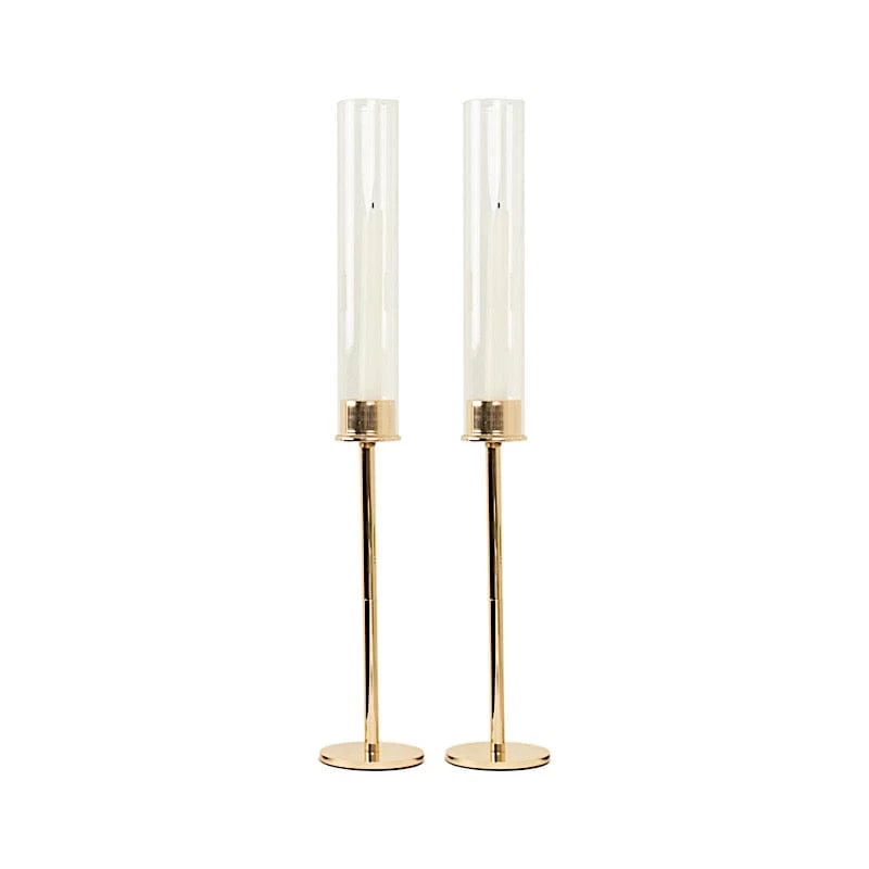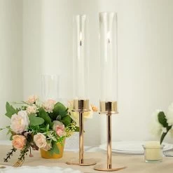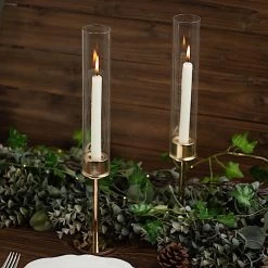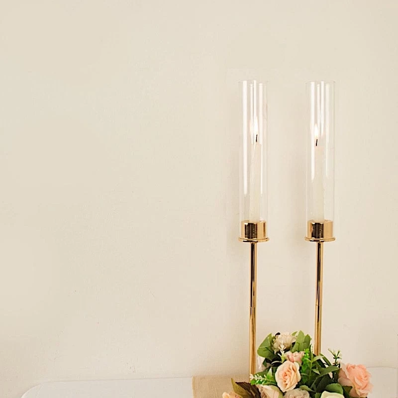 These elegant taper candle holders are the perfect pick to bring a sense of ambiance to any room or space. Featuring a smooth and slender metal base with removable, clear cylindrical glass shades to secure your taper candles. These stylish candle holders are an ideal addition to your wedding, party or event decorations. Use them as centerpieces for your home or as decorations for your special occasions. The possibilities are endless!