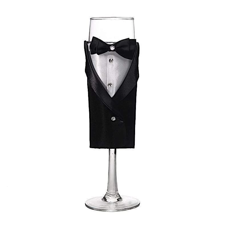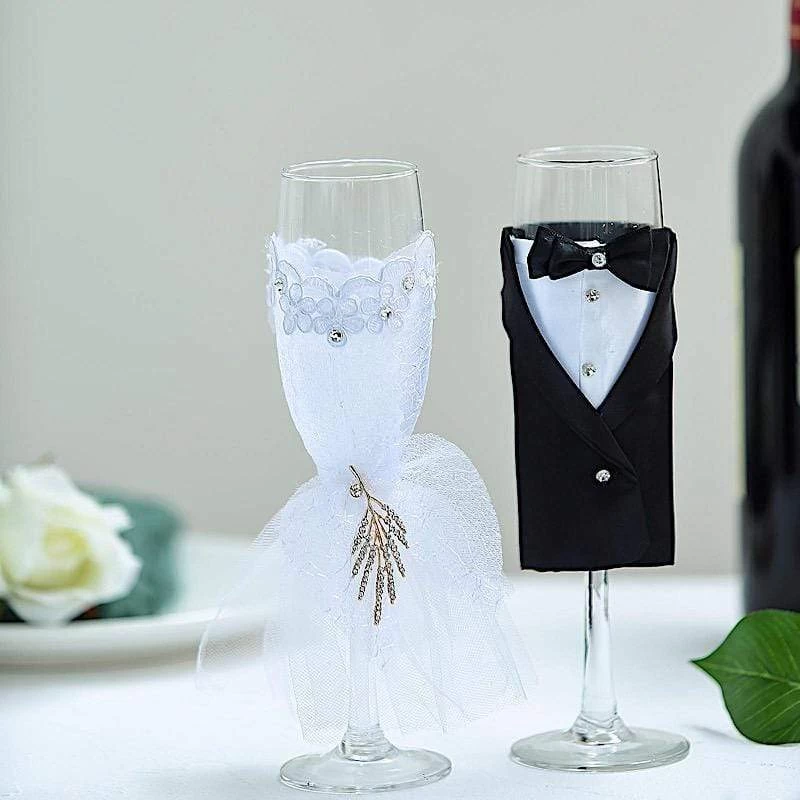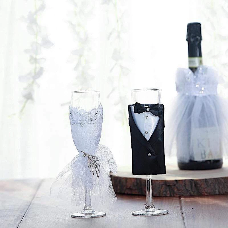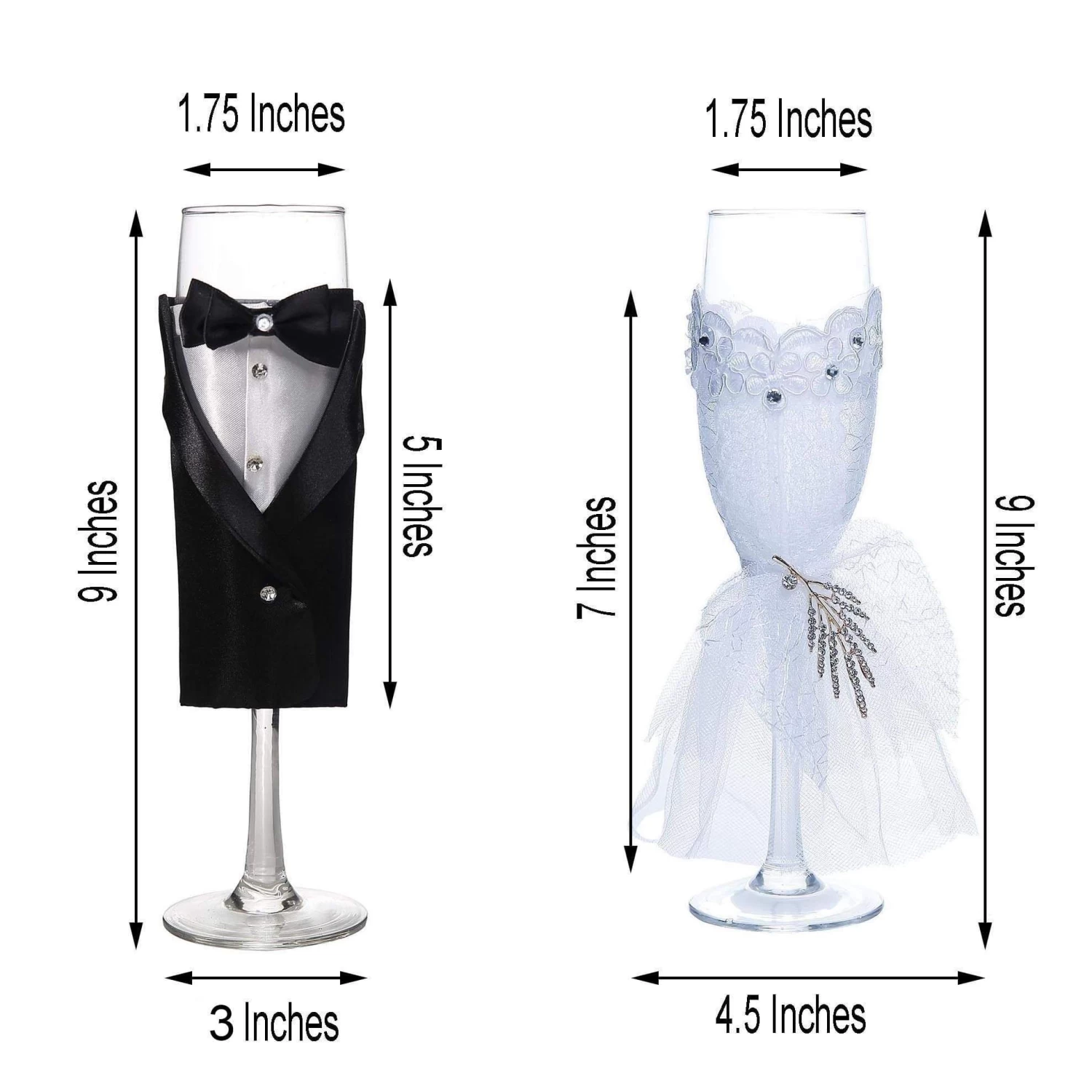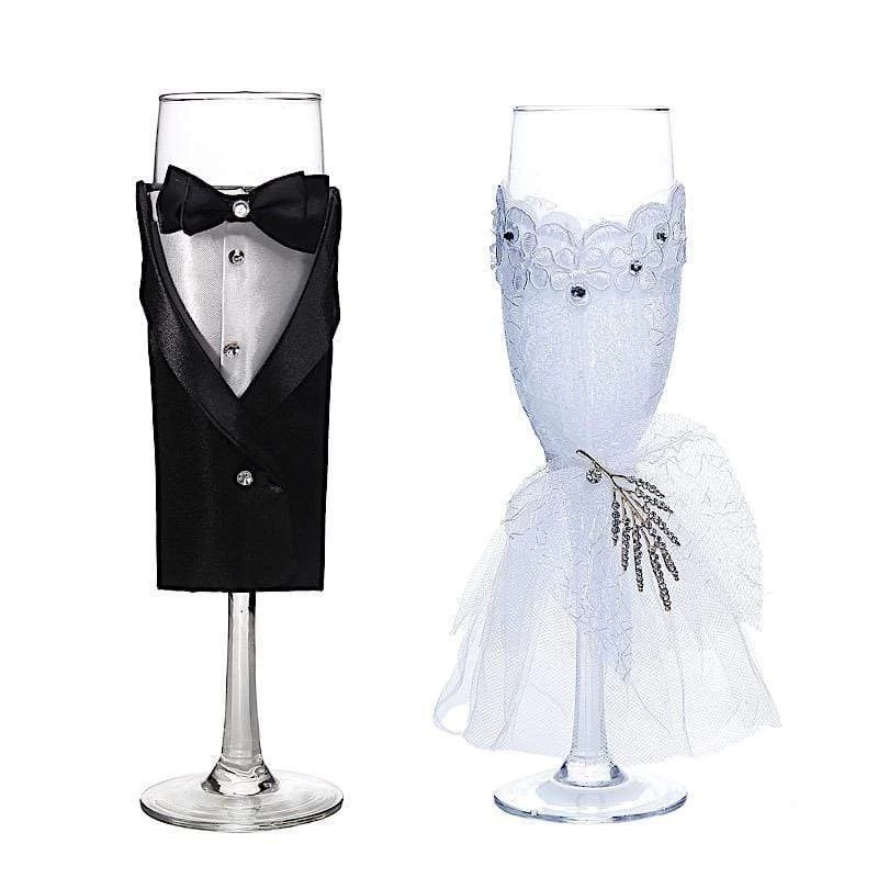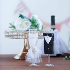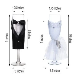 These elegant toasting champagne flutes will surely complement your trendy wedding decorations! Featuring high-quality glass designed with rhinestones accented dress and tuxedo outfit, these toasting flutes will bring a unique touch to your decorations. Great to use for weddings, anniversaries, engagement parties or any romantic moments. Perfect choice for gifting.
