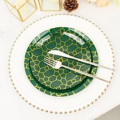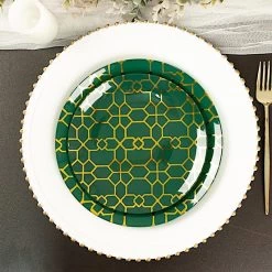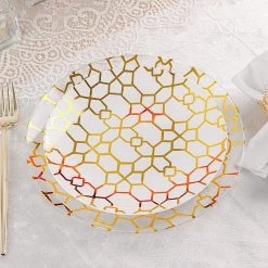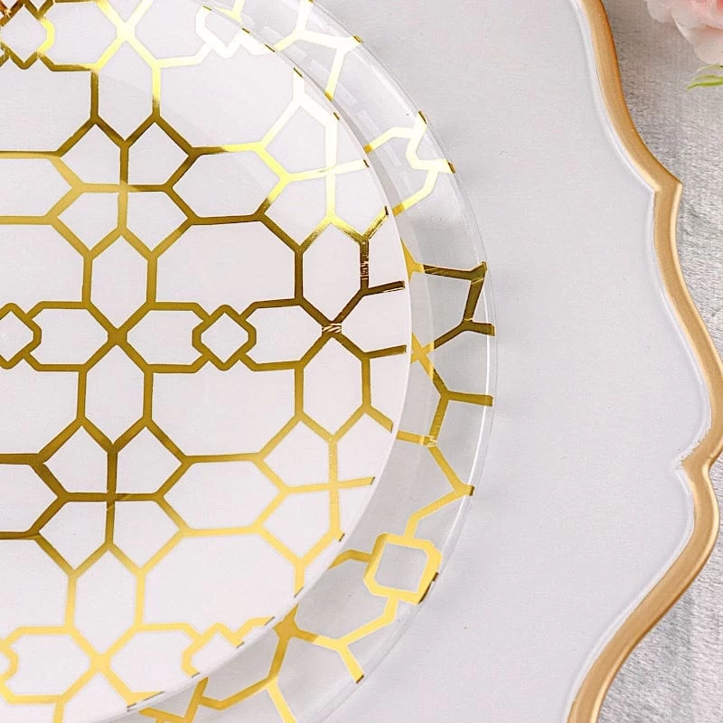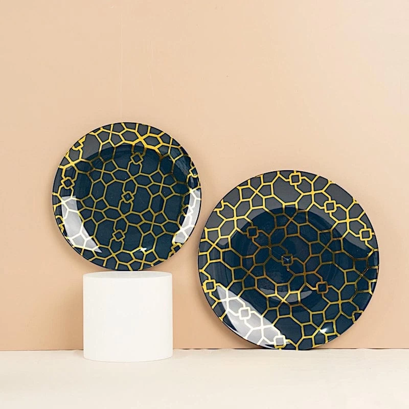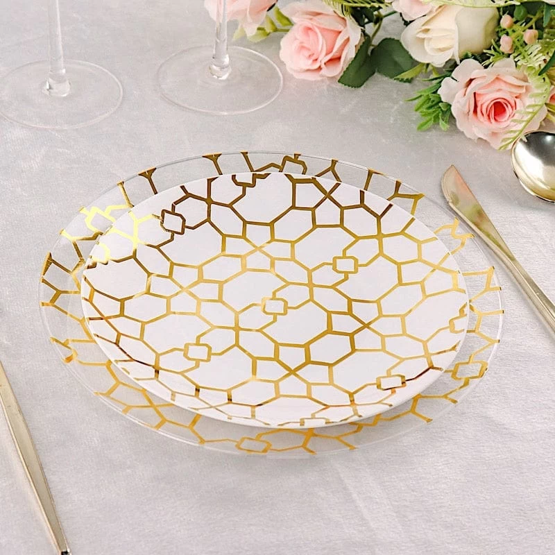 Entertainment just got easier. Serve your guests using these practical yet stylish plates and let your great food speak for itself! High quality plastic plates with a gold geometric design will make any dinner or lunch look extraordinary. Perfect choice for fine dining occasions where fast cleanup is a must! Use these round plastic plates for weddings, bridal showers, baby showers, birthday parties or any special events.