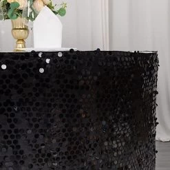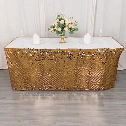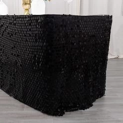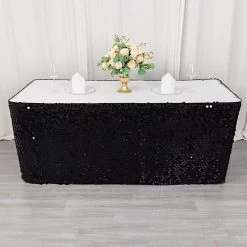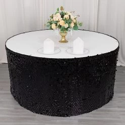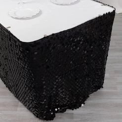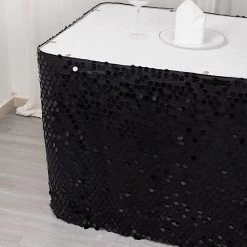 Complete the look of your party tables with dazzling table skirts! Featuring sparkling, payette sequins on mesh fabric with lightweight satin backing, this table skirt will add a touch of glitz to any celebration. Perfect for setting welcoming tables for your wedding receptions, parties, parties or special dinner occasions. This table skirt comes with velcro on top for attachment to clips so they can be easily attached to your tables.