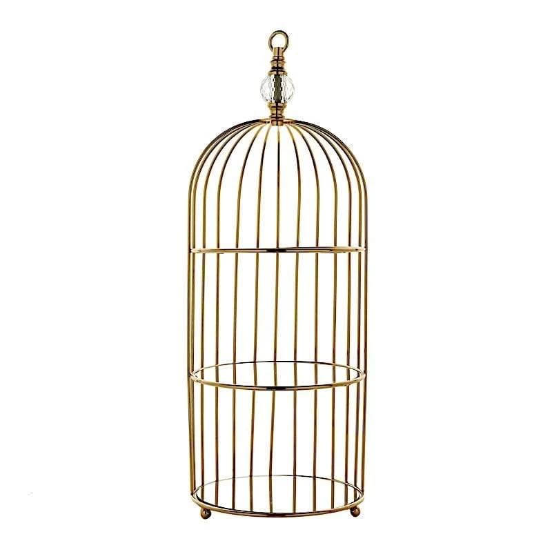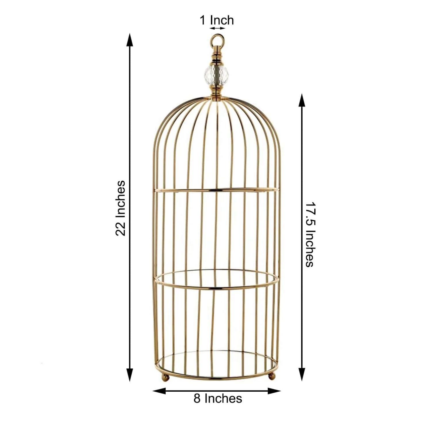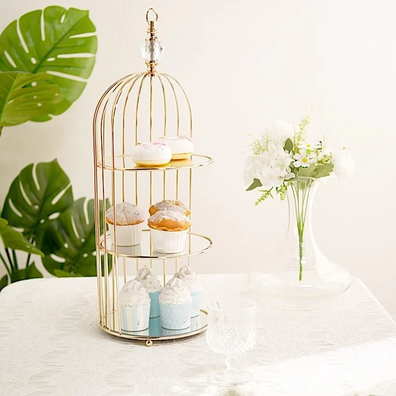 Display your cupcakes in style with this lovely dessert stand! Crafted from high-quality metal with mirror glass, birdcage design and gold metallic finish, this versatile serving stand will create a romantic look for your party table setting. Use it as a decorative hanging decoration or to showcase your elegant candles, flowers, greenery and more. You can also wrap it with charming fairy string lights to create an enchanting centerpiece. The possibilities are endless! Perfect for all occasion cakes, cupcakes or other goodies, this is just the dessert stand you need to bring a bit of sparkle to your celebration.