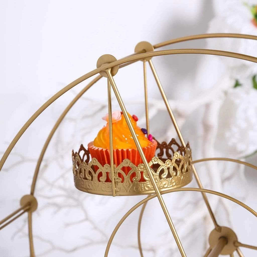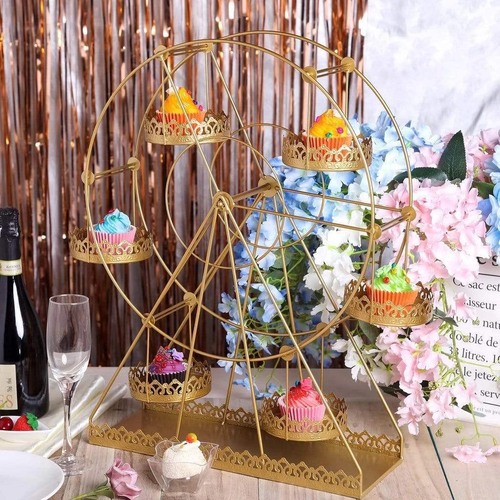 Celebrate your day with something that is both decorative and functional! This rotating metal Ferris wheel cupcake holder stand will make a stunning centerpiece on your carnival themed events, birthdays, wedding and children parties. Fill each basket with appetizers, desserts, sweet treats or pair them with small flowers and fairy lights to create an attractive accent on your dessert table decorations.