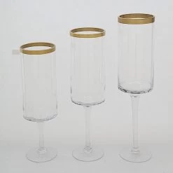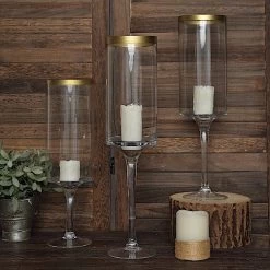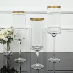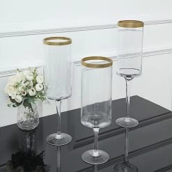 Accent your special day with these graceful glass candle holders! Featuring a cylindrical pedestal with a gold rim and slender long stem, this set of sophisticated candle holders will lend a touch of chic style to your mantel or console table. Simply fill them with elegant candles to create a romantic look to your living space or personalize them with your favorite faux or live flowers and fillers for an extra decorative look. Great for weddings, parties, events or simply using it in your home. The possibilities are endless!