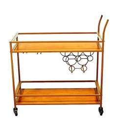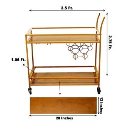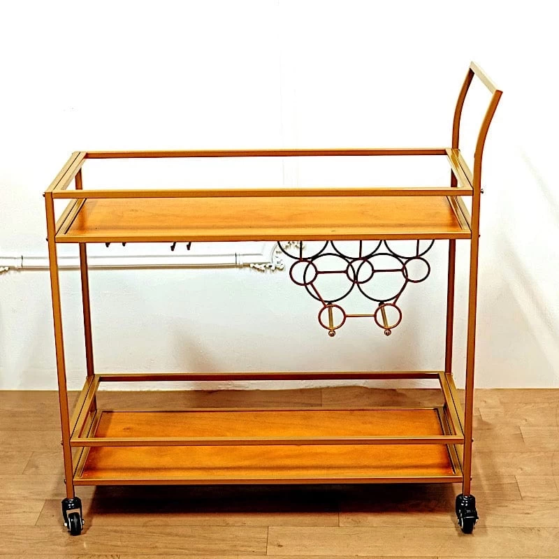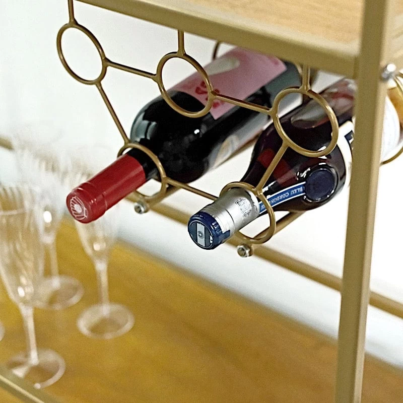 Entertain in style at your next gathering with this elegant bar cart. Ideal as storage, food or drink server or as a decorative display to your space. Featuring a rectangle metal bar cart with 4 wheels for smooth mobility, a convenient handle and rectangular wooden panels that provide spacious shelving. It is also designed with a wine bottle and wine glass racks. This modern piece of small furniture will be a great addition to your contemporary home decor. Use it to serve your beverages and snacks at home, to hold your drink dispenser or display your cake and desserts at your weddings, parties and events. The possibilities are endless!