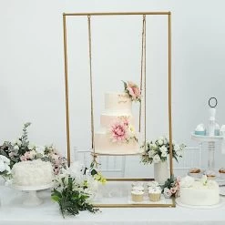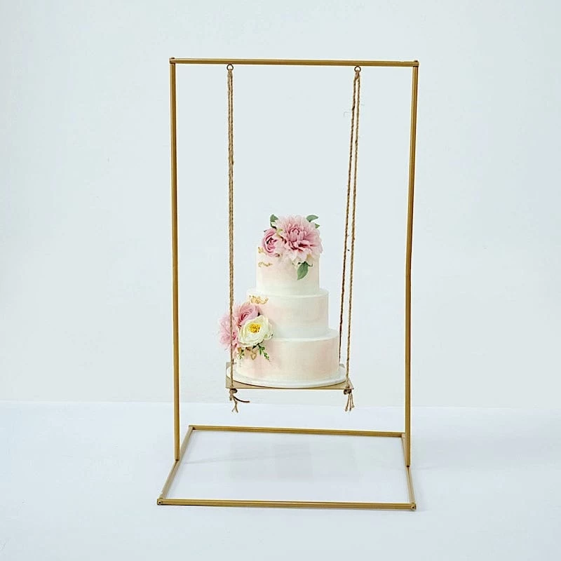 Celebrate your day with something that is both decorative and functional! This stylish swing-like metal cake stand with natural jute ropes will make a fun and exciting hanging dessert display for your weddings, birthdays, parties or any special gatherings. With a spacious square plate to hold your cakes, desserts or any sweet treats, this elegant display stand will elevate the look of your party setting. The possibilities are endless.