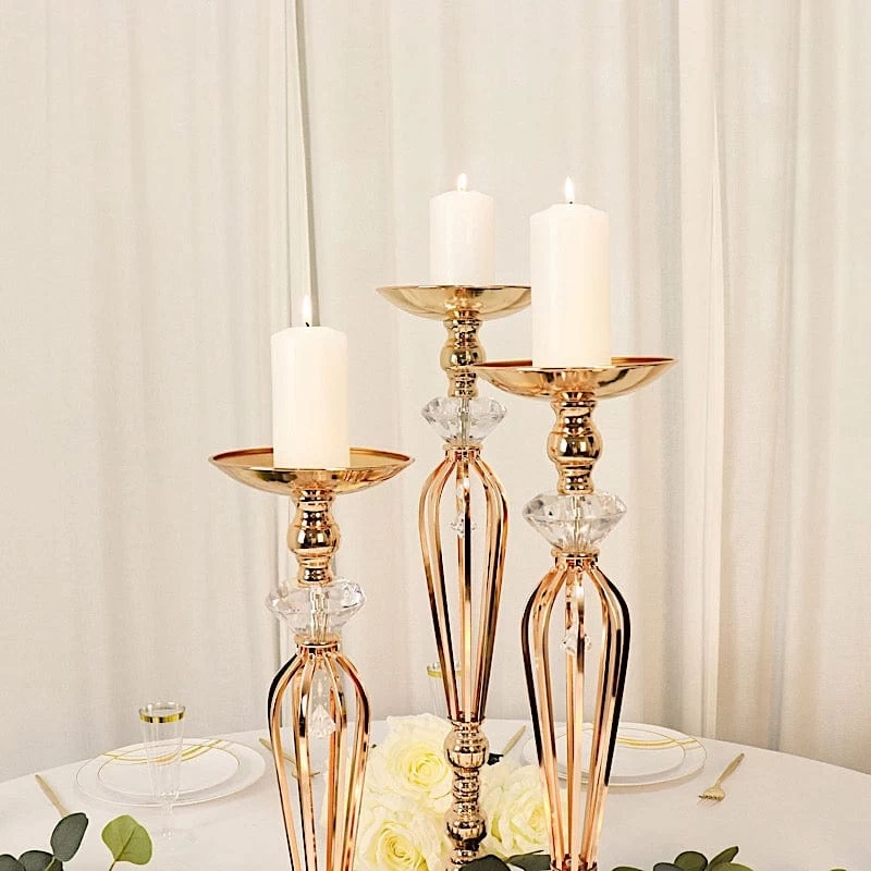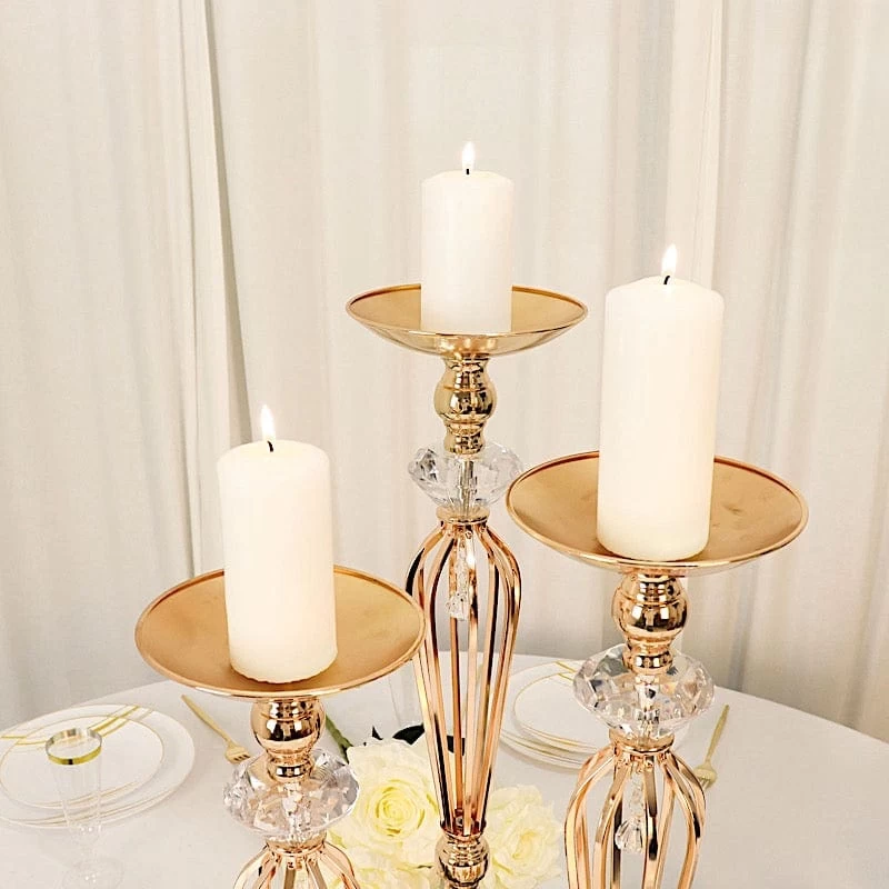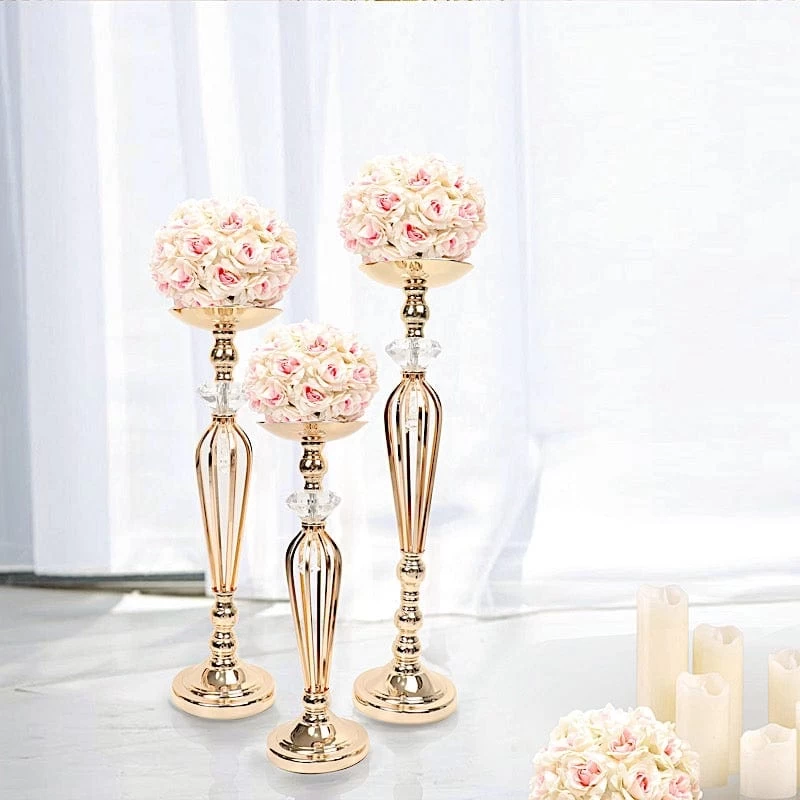 Create elegant decorations for your special day with metal candle holders! Crafted from high quality metal with crystal accents, these dazzling candle holders are excellent for your decor and designs. Use them to showcase your tealight, votive, pillar or LED candles for parties, weddings, events, office or home decor. These decorative pieces are also great as pedestals or stands to display your kissing balls or gorgeous flower arrangements. The possibilities are endless!
