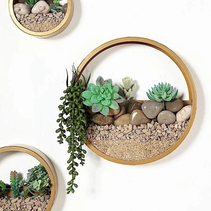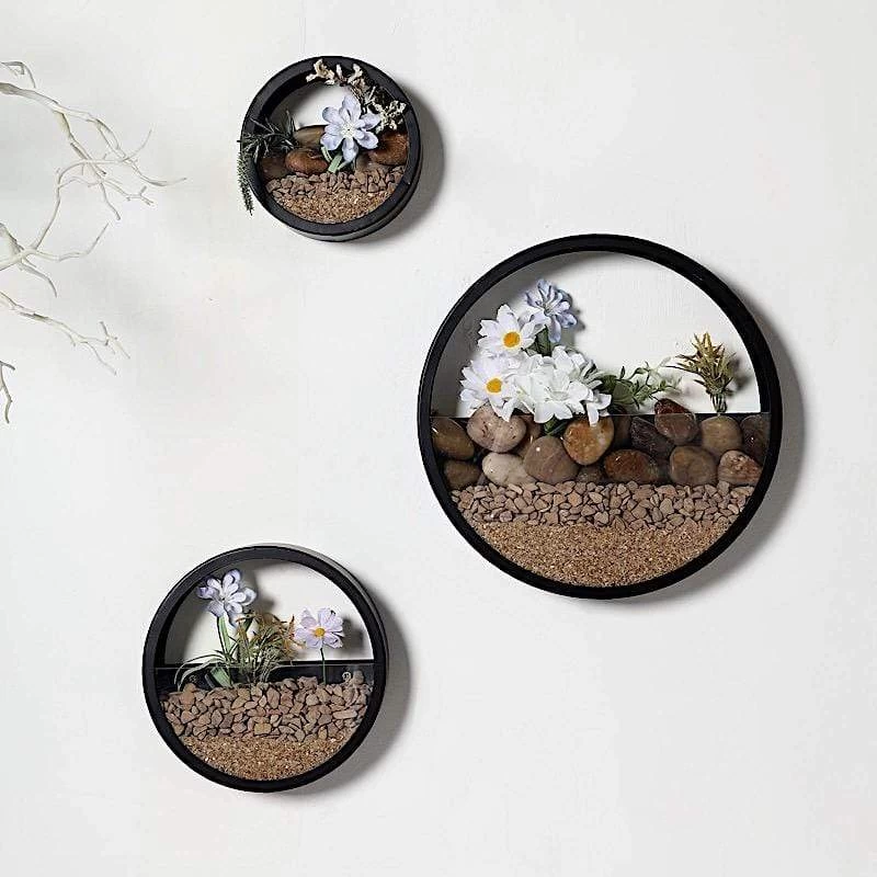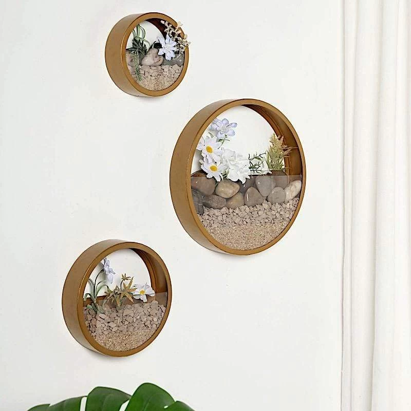 This set of hanging wall planters with clear acrylic panels in the front is a great choice for creating an eye-catching metal accent on your walls. Perfect for adding a modern touch to your living space! Use these stylish floating shelves to showcase your small artificial greenery, plants, flowers, gravel, pebbles, sand art and more! Hang them on walls in your bedroom, living room, kitchen or anywhere you like. These multipurpose floating wall planters are just the perfect picks if you like to create a contemporary design for your home. Also a great gifting idea.