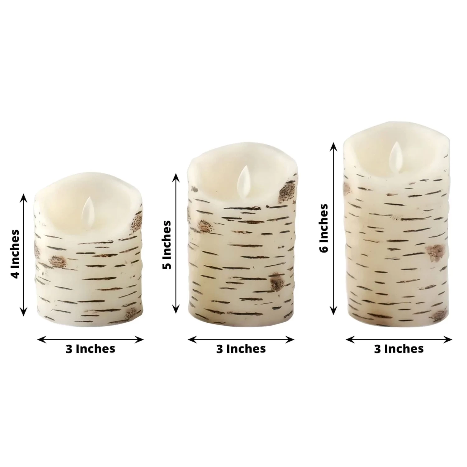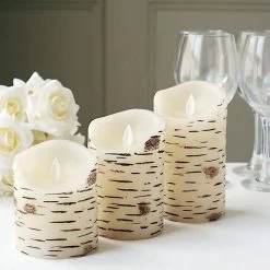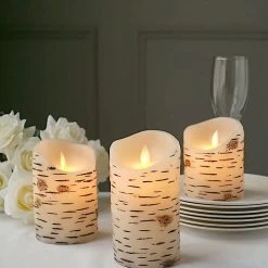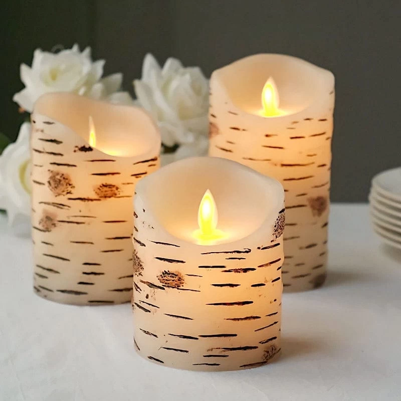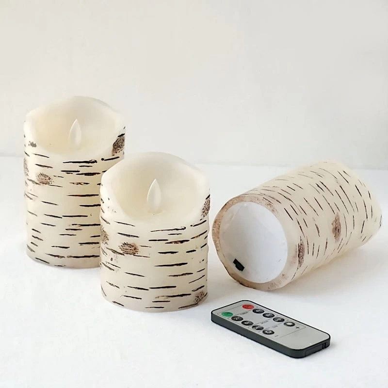 There are no more worries about burning flames or dripping wax with these charming LED candle lights! Featuring pillar candles look with a birch bark design and a remote control, these LED candle lights are sure to create a romantic ambiance for your wedding, events, parties or even to your own home. Put them on your dinner tables and make every meal with your loved ones extra special. These LED lights are battery operated with 3 AAA batteries that are not included.