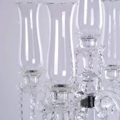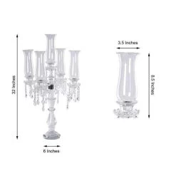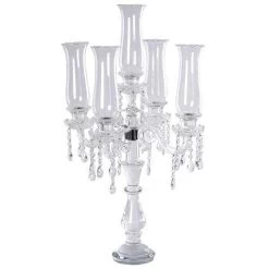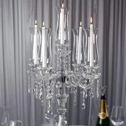 This elegant glass candelabra candle holder is the perfect pick to bring a sense of ambiance to any room or space. Featuring a clean, crystal like look from top to bottom, this stylish glass piece is an ideal addition to your wedding, party or event decorations. Designed with a round base, slender stem and 5 stylish hurricane glass holders at the top to support your taper candles. Glass holders are accented with detachable crystal chains for an extra decorative look. This candelabra candle holder can also be used on its own as a centerpiece for your event tables to highlight its modern look. The possibilities are endless!