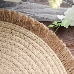 Create the perfect mood for every dinner occasion with these rustic placemats! These multipurpose round placemats with fringed trim can be used in a variety of ways. Whether as a base for dinnerware or for your gorgeous centerpieces, these reusable non-fading placemats will create a trendy look and style for your formal or casual table setting. Surprise your guests with a charming and unique tablescape. The possibilities are endless!