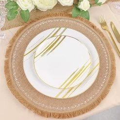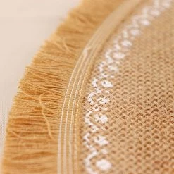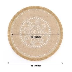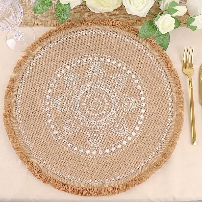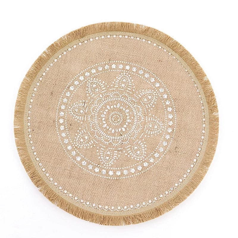 Create the perfect mood for every dinner occasion with these rustic placemats! These multipurpose round placemats with white prints and fringe trim can be used in a variety of ways. Whether as a base for dinnerware or for your gorgeous centerpieces, these reusable non-slip placemats will create a trendy look and style for your formal or casual table setting. Surprise your guests with a charming and unique tablescape. The possibilities are endless!