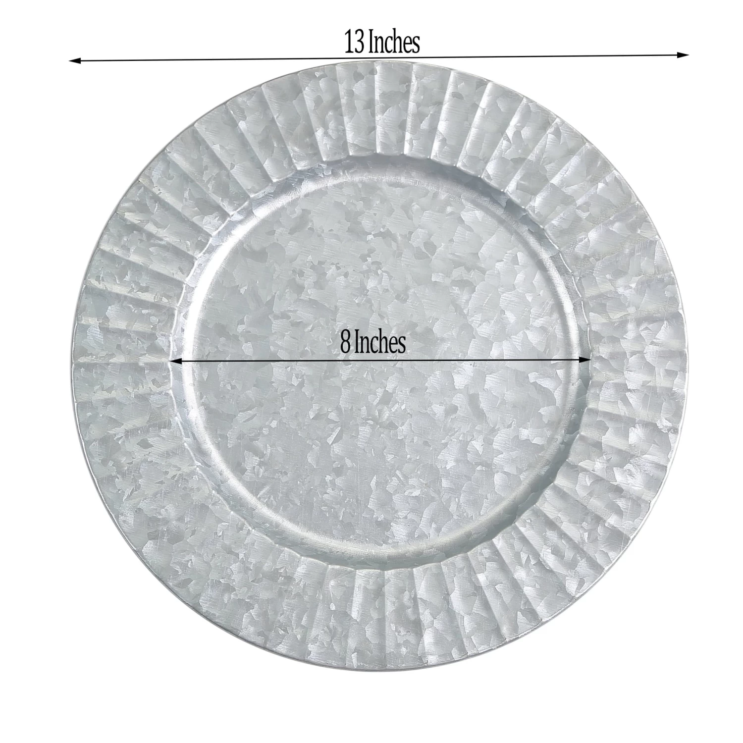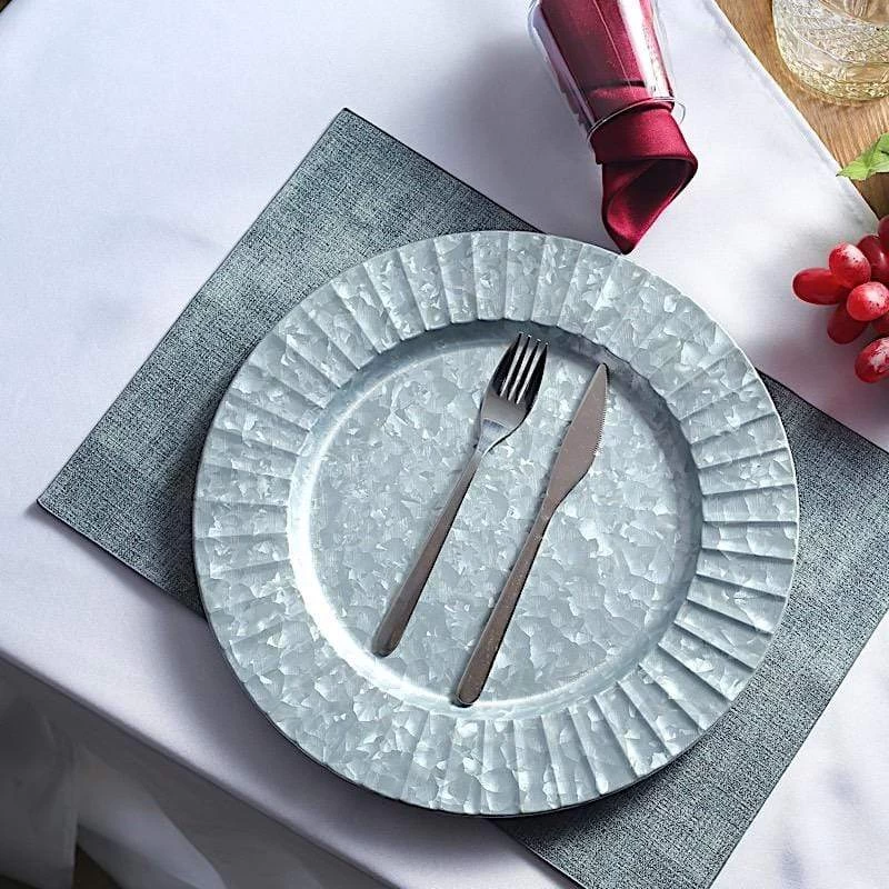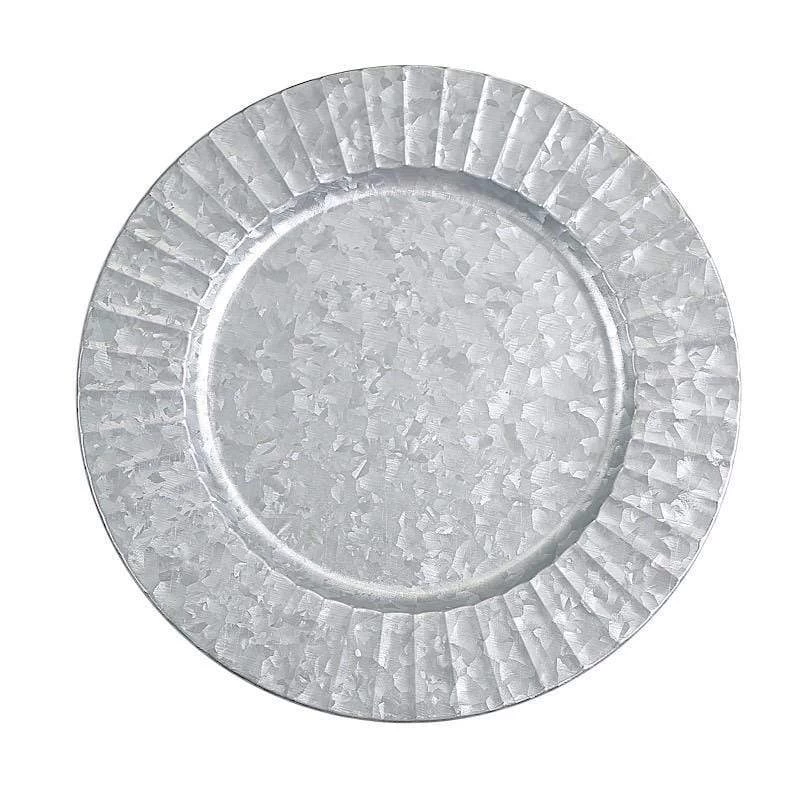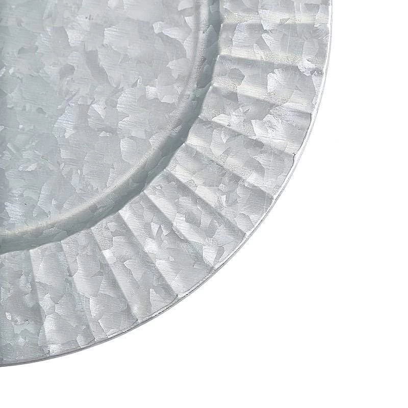 Add a rustic charm to your table setting with these round galvanized metal charger plates! These chargers with stylish ruffled edge are perfect for special occasions like holiday or traditional dinners, bridal showers, graduation luncheons, birthday parties and more. These dinner plate chargers can be easily styled with more delicate dinnerware in light colors and soft tones. They are easy to clean, just wash with hot water.