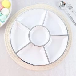 Serve your food and snacks in these stylish and multifunctional plastic serving trays. These round serving trays are designed with 6 spacious sections and sparkling metallic trim that makes them a perfect addition to your party tables. These convenient trays can function as a serving platter or nachos and salsa plate for birthdays, weddings parties and events or as organizers of small items in your home. Great gifting idea for family and friends.