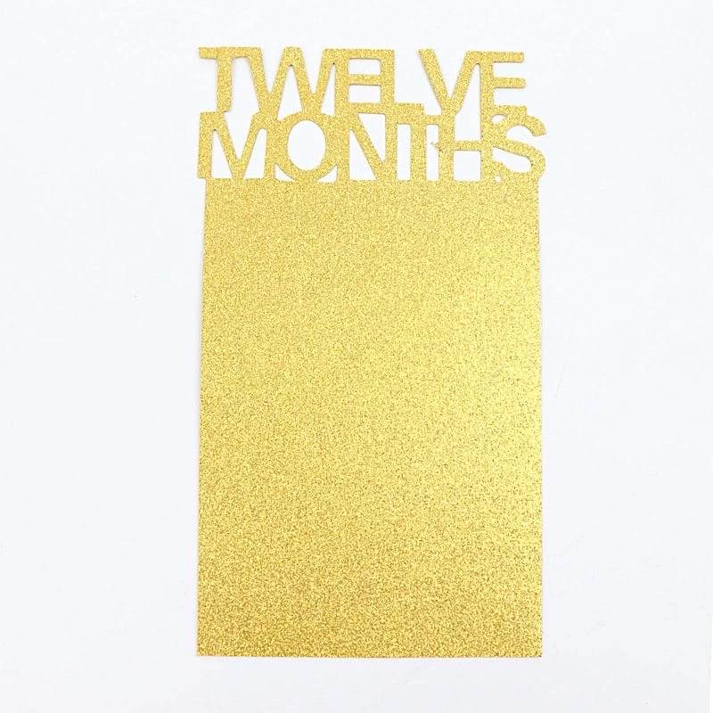 Shipped with a plastic needle, a ribbon roll, 20 glue dots and 12 photo card stocks with glittered 12 months design.