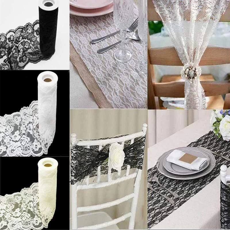 Use this lace tulle for your do-it-yourself wedding craft projects. You could make your own veil, wrap your wedding favors, create your own pew bows and swag and drape it through your aisle and/or decorative arch, decorate your tables, etc.. Streamers of tulle can be draped from the ceiling to various points around the room. Tie simple ribbon bows to the tulle to create a garland affect.