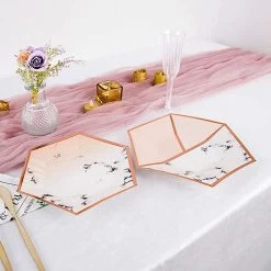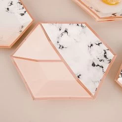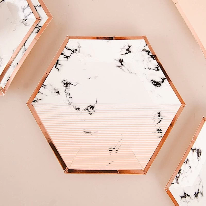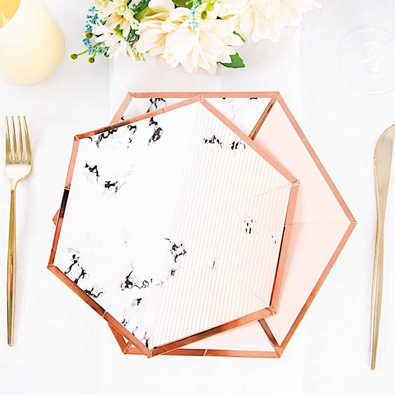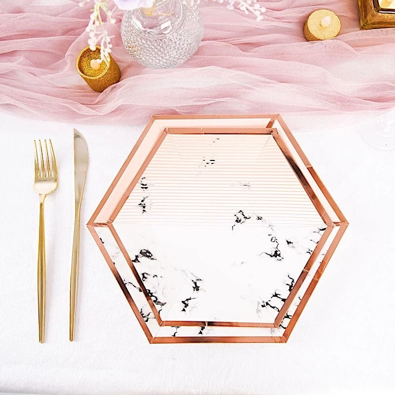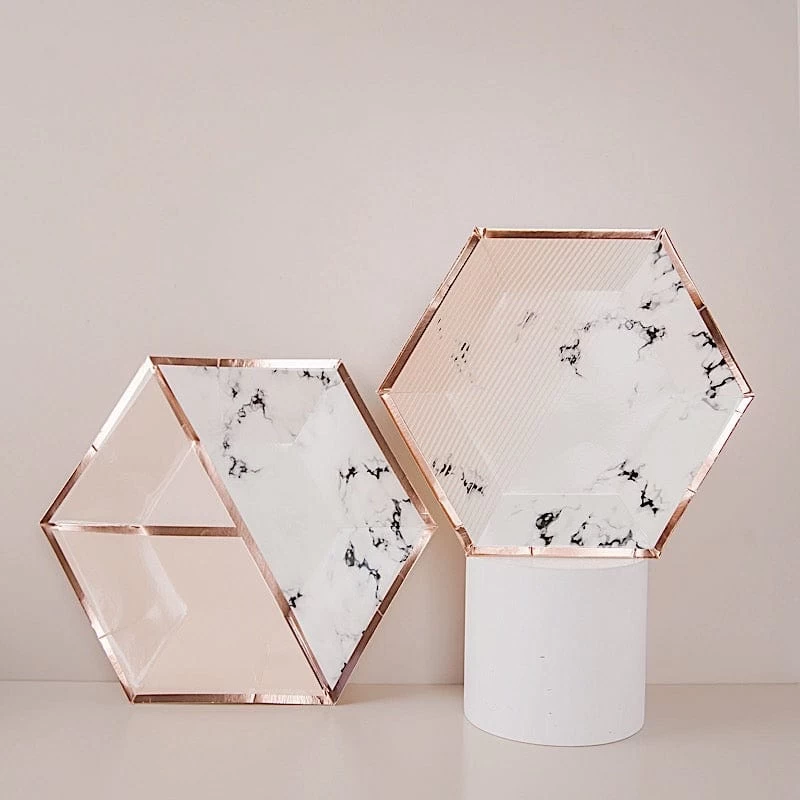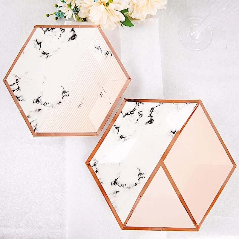 Entertainment just got easier. Serve your guests using these practical yet elegant plates and let your great food speak for itself! High quality paper plates in a geometric shape will make any dinner or lunch look extraordinary. Great alternative for plastic plates and a perfect choice for fine dining occasions where fast cleanup is a must! Use these paper plates for weddings, bridal showers, baby showers, birthday parties or any special events.