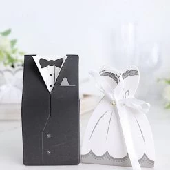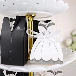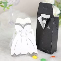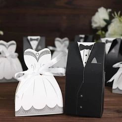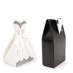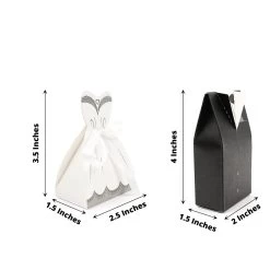 These stylish favor boxes are perfect for holding little goodies for your guests on special occasions! Featuring paper wedding dresses and tuxedo sets with the included ribbons, these favor boxes will allow you to present your special treats with charm and romantic style. Have fun personalizing them and let these favor boxes bring a decorative touch to any place setting or favor table at any events, princess-themed parties, birthdays or trade shows.