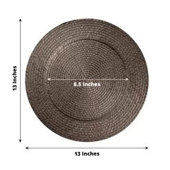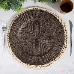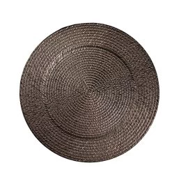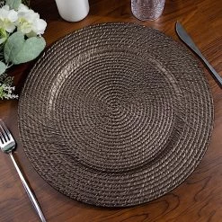 Add an elegant flair and a chic style to your table setting with these plastic charger plates! These round chargers with a rattan-like design are perfect for your weddings, indoor or outdoor dinner parties, bridal showers, graduation luncheons, birthdays and more. They are easy to clean, simply wash them with hot water.