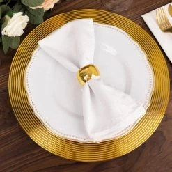 Add an elegant flair and a chic style to your table setting with these round acrylic charger plates! These chargers with sophisticated lined rim design are perfect for indoor or outdoor receptions, bridal showers, graduation luncheons, birthday parties, weddings and more. They are easy to clean, just wash them with hot water.