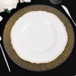 Add an elegant flair and a chic style to your table setting with these round acrylic charger plates! These chargers with a sophisticated pearl beaded trim are perfect for indoor or outdoor receptions, bridal showers, graduation luncheons, birthday parties, weddings and more. They are easy to clean, just wash them with hot water.
