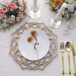 Add an elegant flair and a chic style to your table setting with these round acrylic charger plates! These chargers with a sophisticated floral cutout design are perfect for indoor or outdoor receptions, bridal showers, graduation luncheons, birthday parties, weddings and more. They are easy to clean, just wash them with hot water.