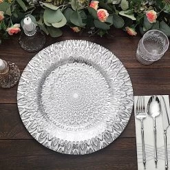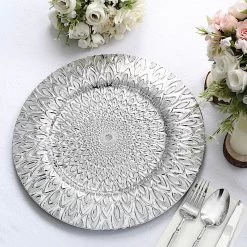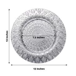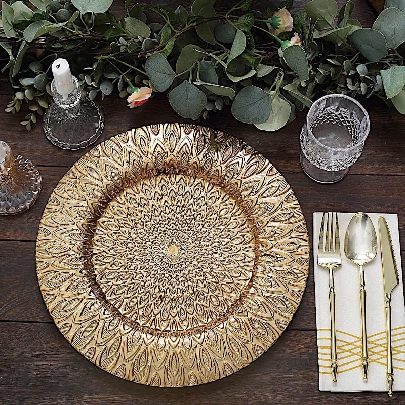 Add an elegant flair and a chic style to your table setting with these round plastic charger plates! These chargers with an embossed peacock pattern are perfect for your weddings, indoor or outdoor dinner parties, bridal showers, graduation luncheons, birthdays and more. They are easy to clean, just wash them with hot water.
