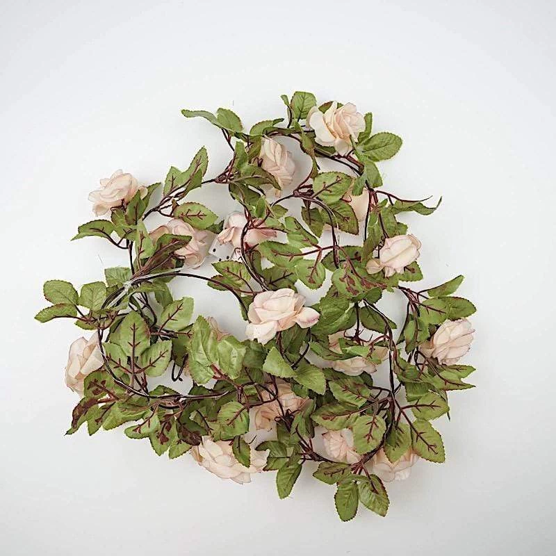 Provide romantic lighting to any decorations with this LED roses greenery garland! Featuring a combination of realistic flowers and refreshing silk leaves with bright fairy string lights, this LED garland will create a dazzling look for your wedding reception, parties, events or any special occasion. Created with a bendable wire stem, this battery-operated garland can be used as backdrops or as an accent to your table centerpieces, pillars, arches, poles, banisters or floral decor to create a fairytale effect.