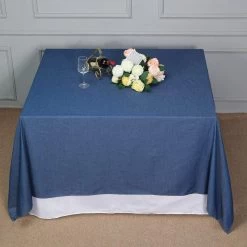 Celebrate your special day and set a particularly welcoming tabletop for your wedding reception or party with blue denim table overlays! This denim like fabric is adorned with orange thread seams on all edges. Denim solid pattern blends well with all types of rustic decor and adds a bold accent of color for your decorations for country weddings, receptions, parties, catered presentations, bridal and baby showers, birthdays, candy buffets, dessert tables and more.