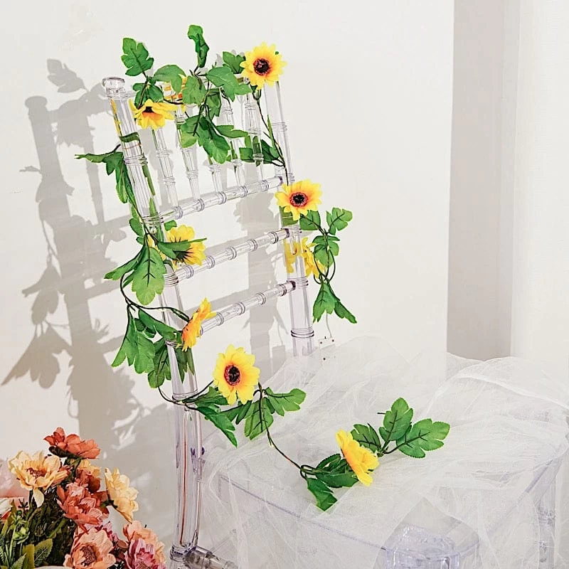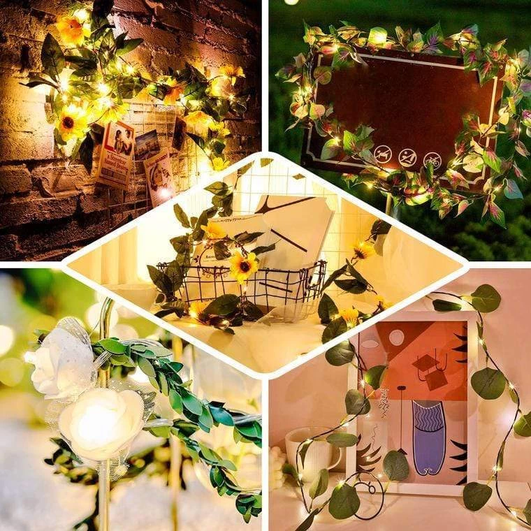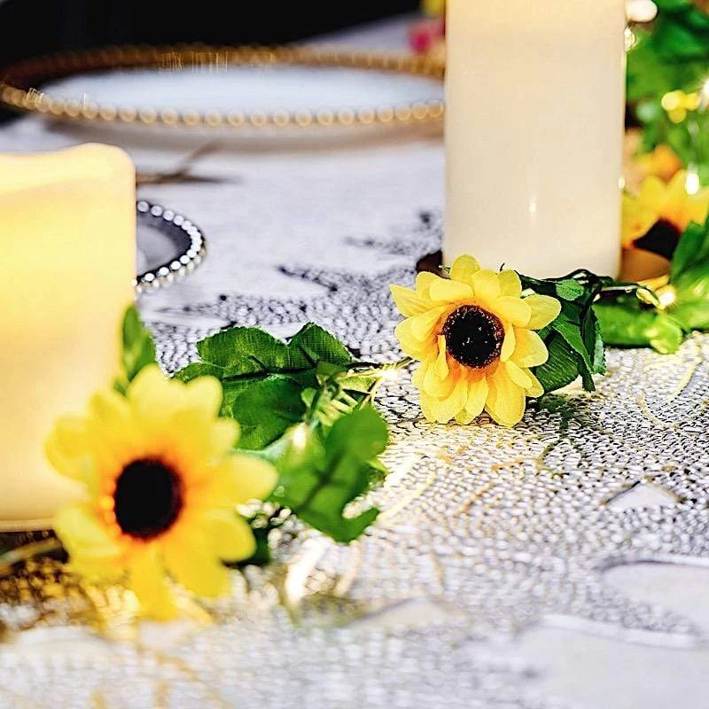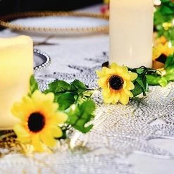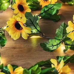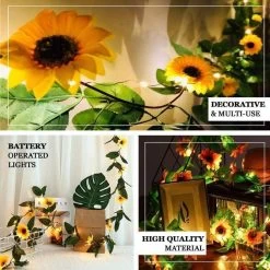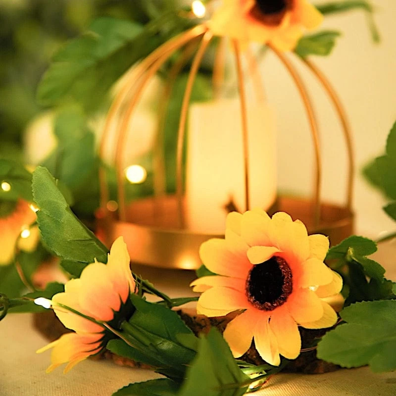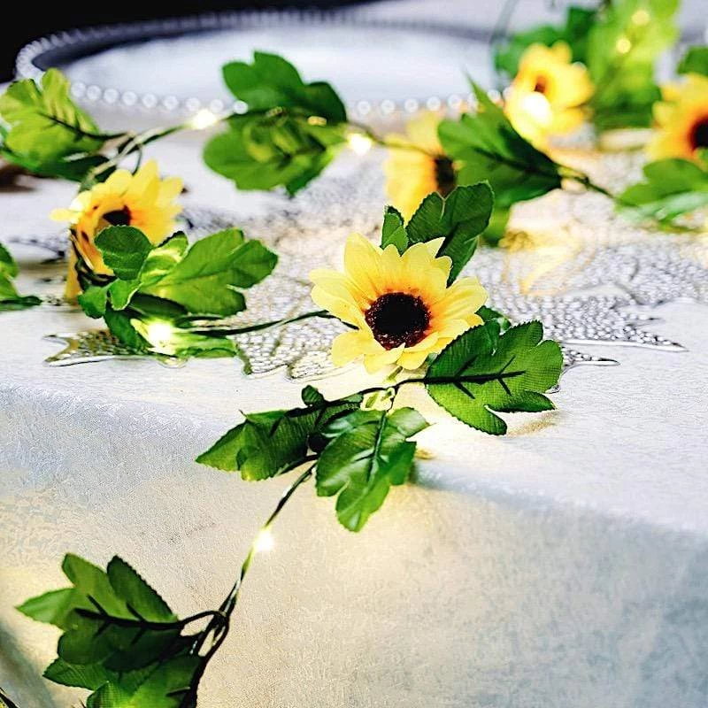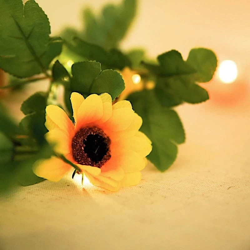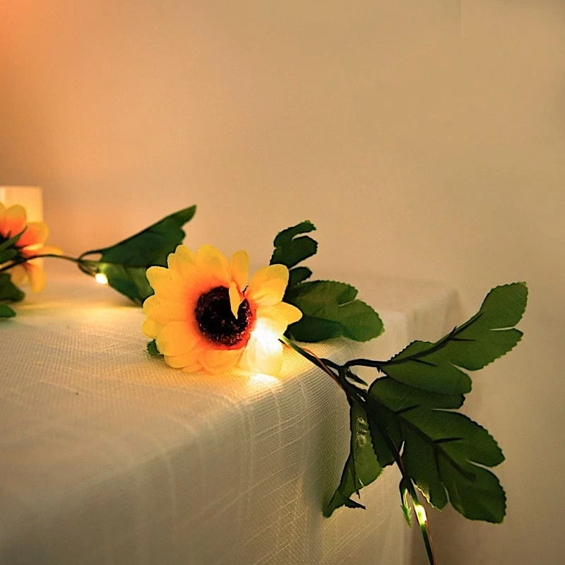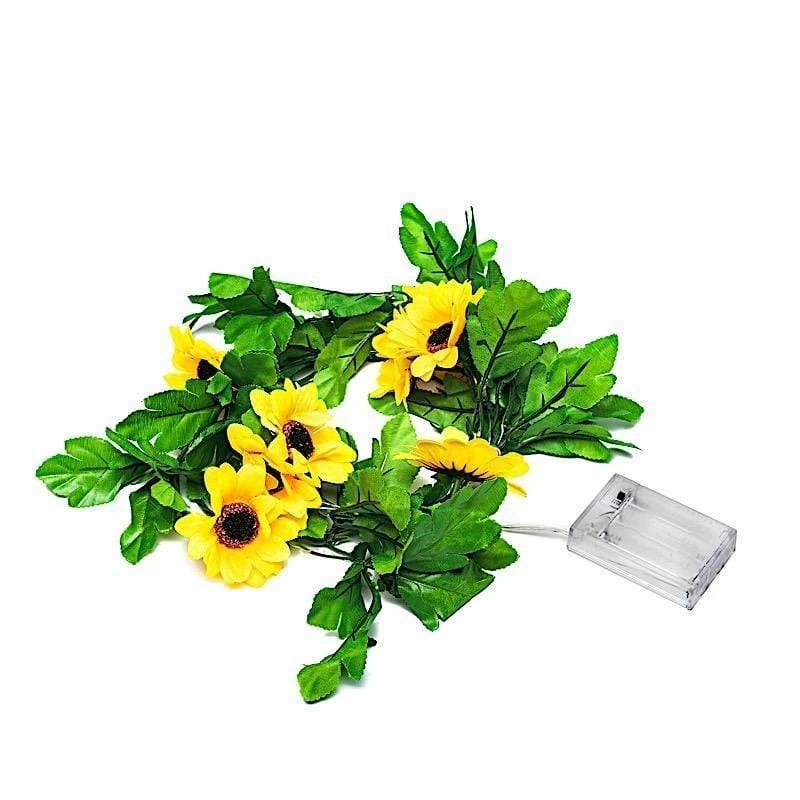 Provide romantic lighting to any decorations with this LED sunflower greenery garland! Featuring a combination of realistic flowers and refreshing silk leaves with bright fairy string lights, this LED garland will create a dazzling look for your wedding reception, parties, events or any special occasion. Created with a bendable wire stem, this battery-operated garland can be used as backdrops or as an accent to your table centerpieces, pillars, arches, poles, banisters or floral decor to create a fairytale effect. These LED lights are battery operated with 3 AA batteries that are NOT included.