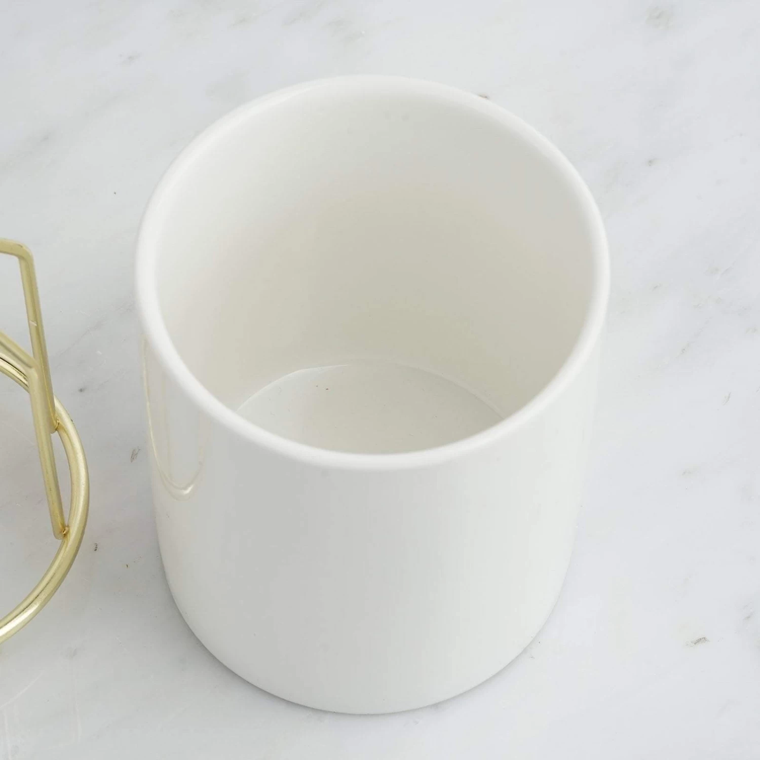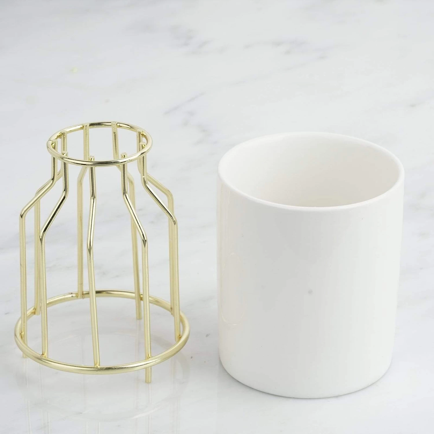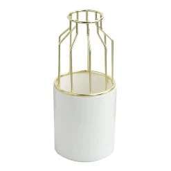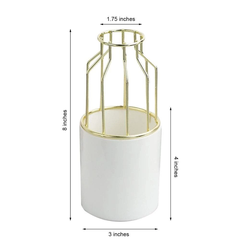 Add depth and dimension to your display with a tapered gold wire and white ceramic bottom vase. Contemporary vases are versatile and easy to pair with other tabletop decorations. This vase can be accented with a variety of mini flowers or candles. It is perfect for weddings, events, and parties as centerpieces, or simply as decorative pieces for your home. Also makes a lovely gift.