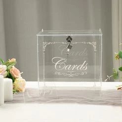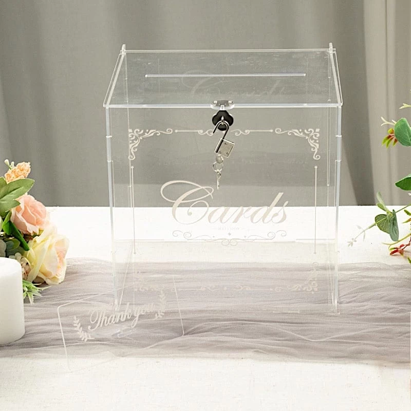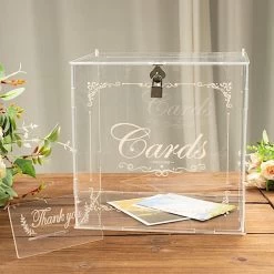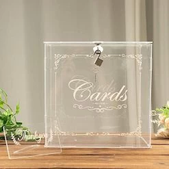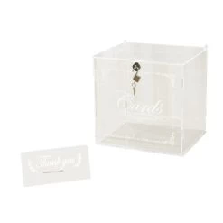 This functional card box is a gift that will give couples something to look back on in the years to come. Allow your guests to insert thoughtful gifts and cards in a clear acrylic box with a stylish “Cards” print at the front. What a fun and exciting way to receive sweet words and well wishes! This unique card box set comes with a lock, key and a “Thank You” sign stand that will complete the look of your reception entrance table display. It will also make the perfect decor for your weddings, themed parties and events. The possibilities are endless!