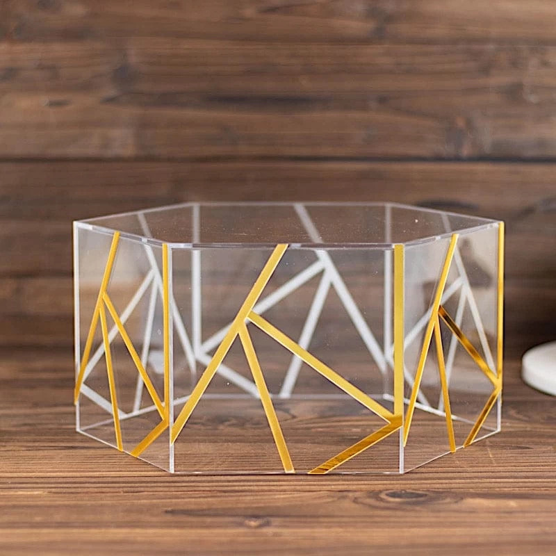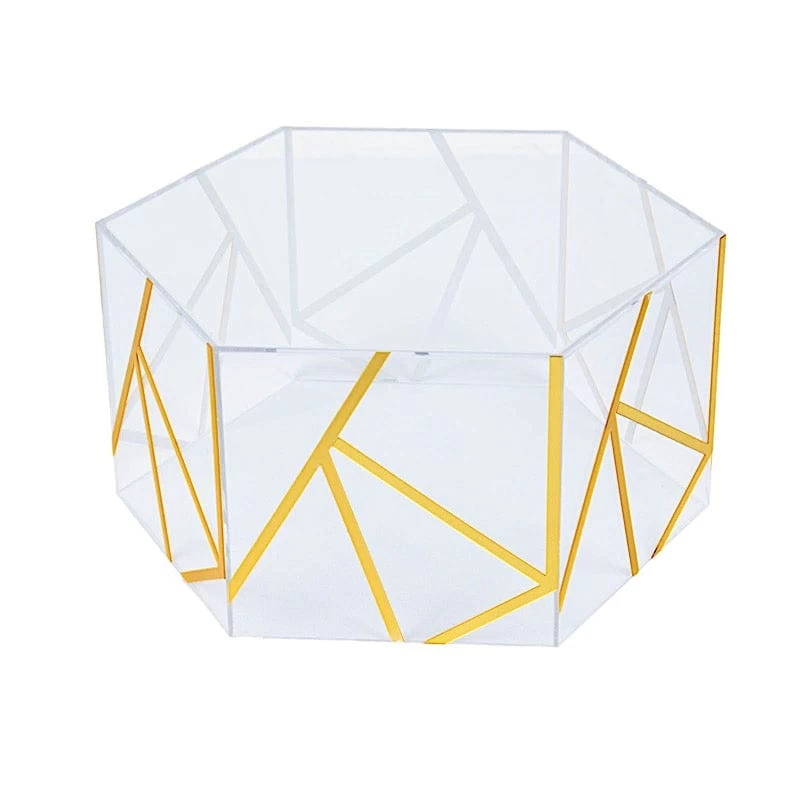 Stay stylish in any setting with this eye-catching stylish acrylic display box! This transparent multipurpose box with an open bottom and geometric design is perfect for making a unique presentation of your lovely decorations. Create your own centerpiece design by pairing it with your charming flower arrangements, candles or LED decors and anything you can think of. This hexagonal display box can also be used as a cake stand, cupcake and dessert pedestal for your weddings, parties and events. The possibilities are endless!