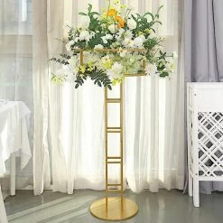 Enhance your special day with stylish flower stands! Crafted from metal, this stand provides a contemporary look with an openwork, round halo top design and a gold finish for a modern flair. This flower pedestal is easy to pair with other tabletop decorations and can be accented with a variety of flowers and greenery. Perfect for weddings, events and parties as centerpieces, or simply as decorative pieces for your home or office.