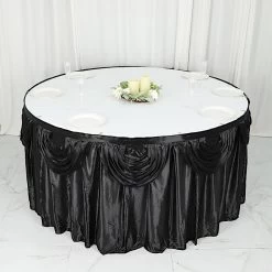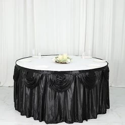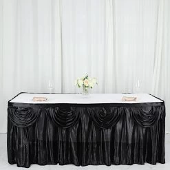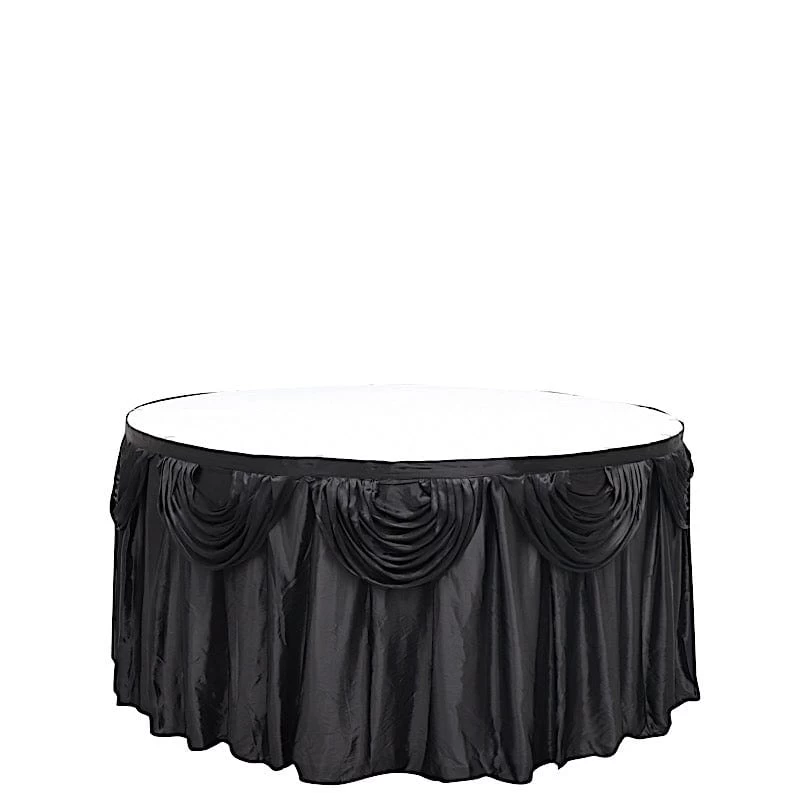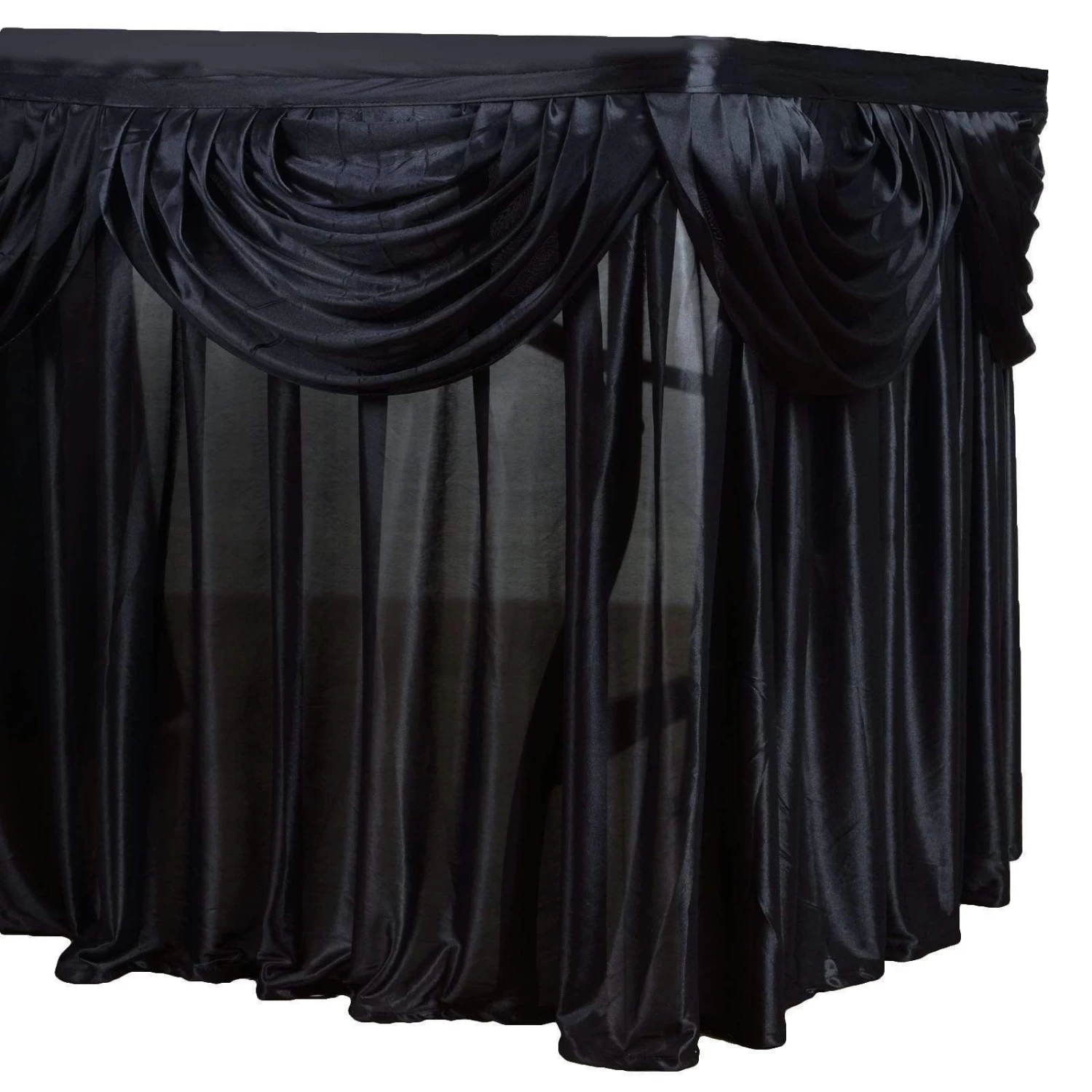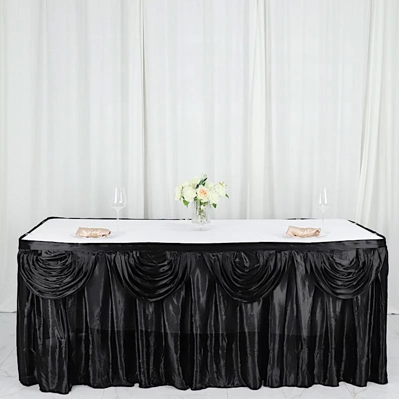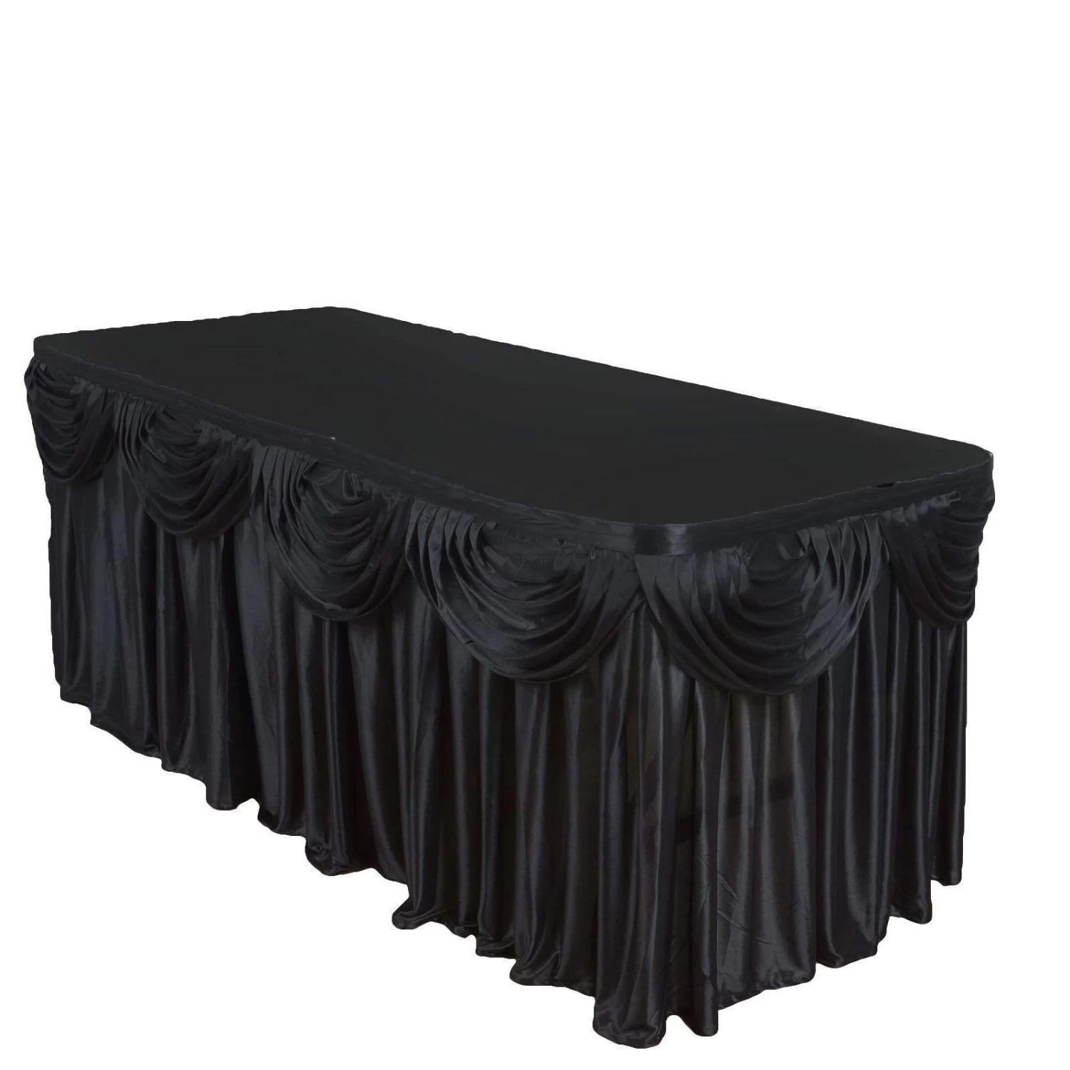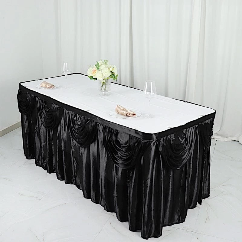Celebrate your special day and set particularly welcoming tables for your wedding reception or party with these beautiful table skirts. Decorating is easy with this double draped look for banquet tables. All table skirts come with velcro on top for attachment to clips so they could be easily attached to your tables.