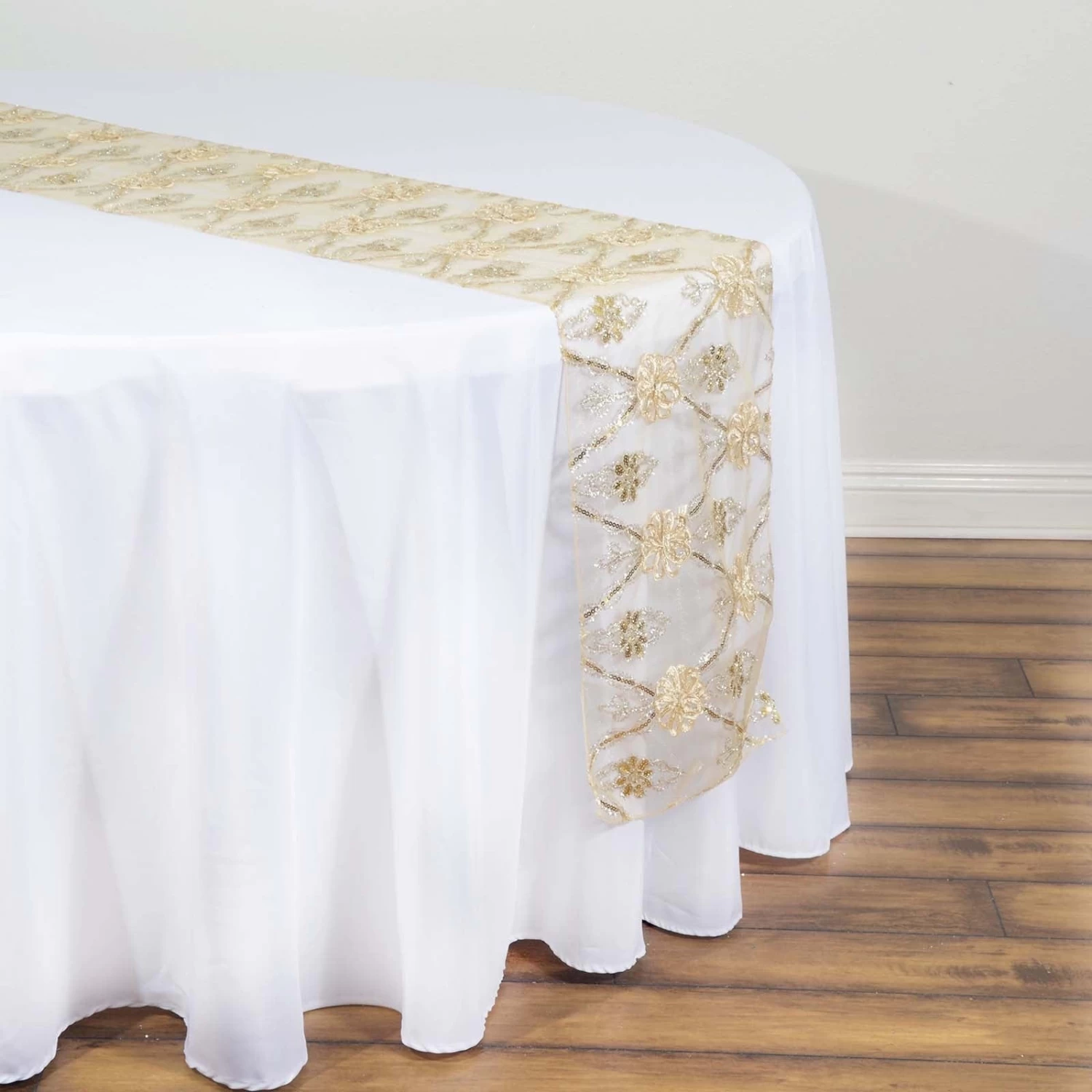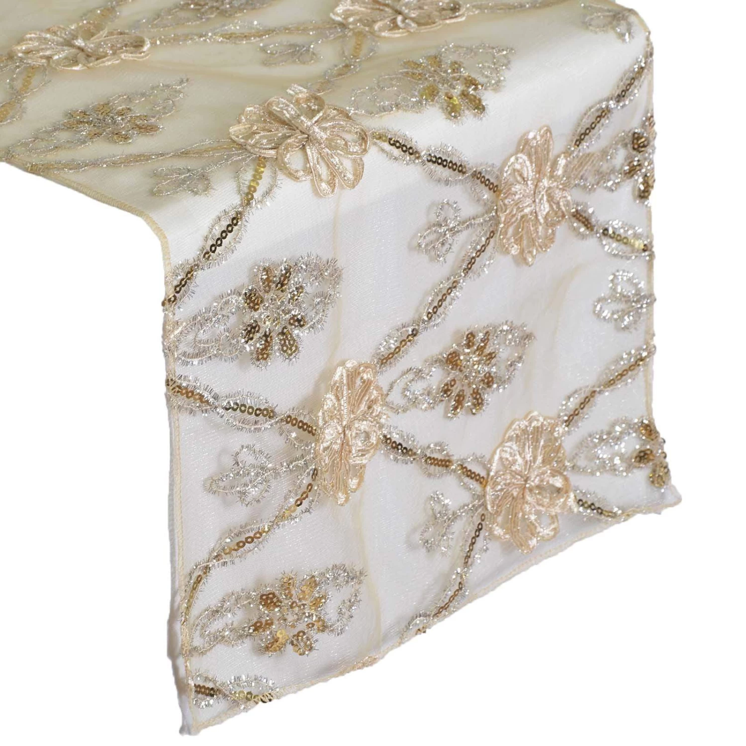 Enhance your special day with your reception accented with these sequined flowers lace runners. Elegant soft lace with sequined floral pattern table runners are perfect for any romantic event. Together with your beautiful centerpieces and table setting, this high-quality fabric will create an inviting ambiance for your guests. Dress up your reception with ease or make your dinner tables look truly special with table runners from Balsa Circle!