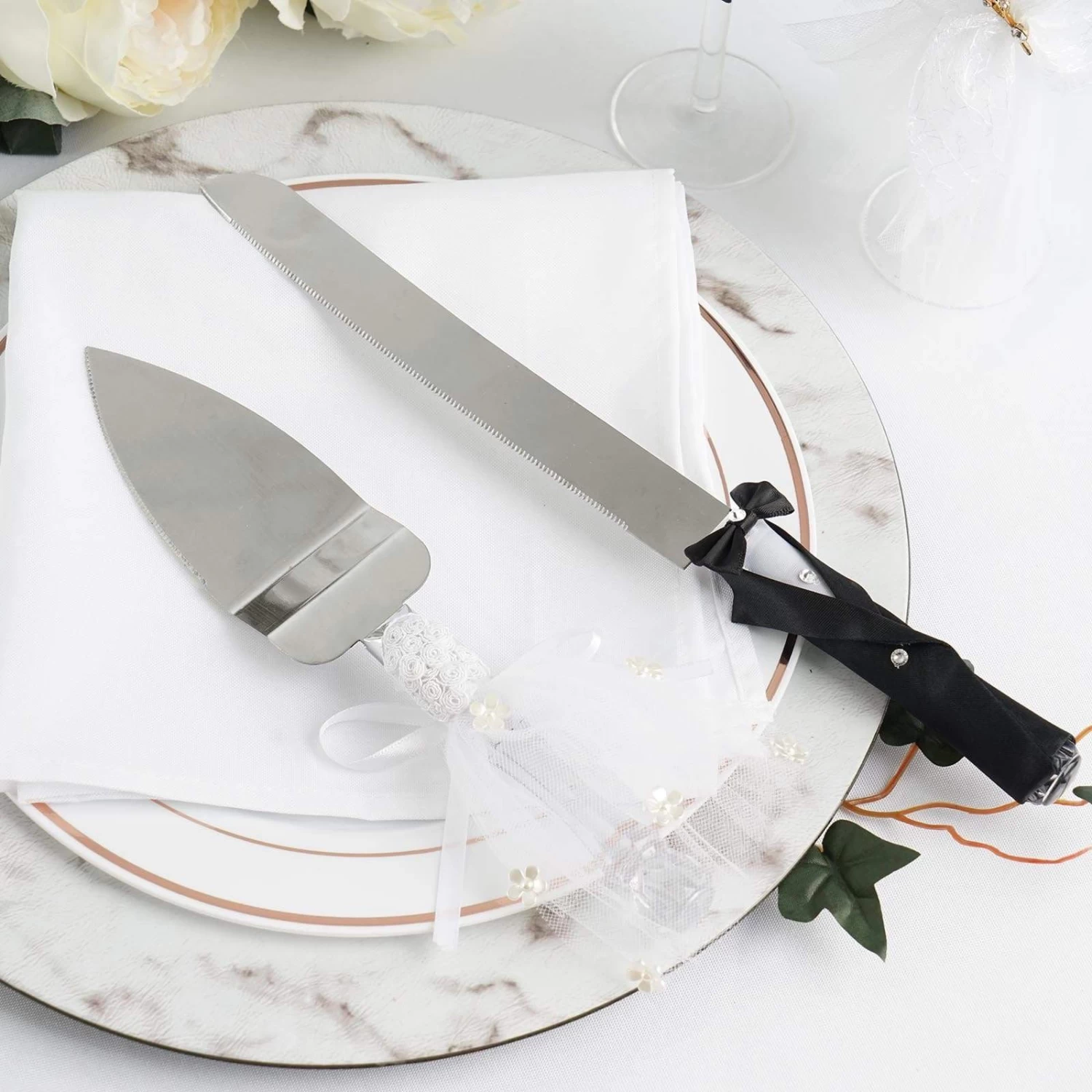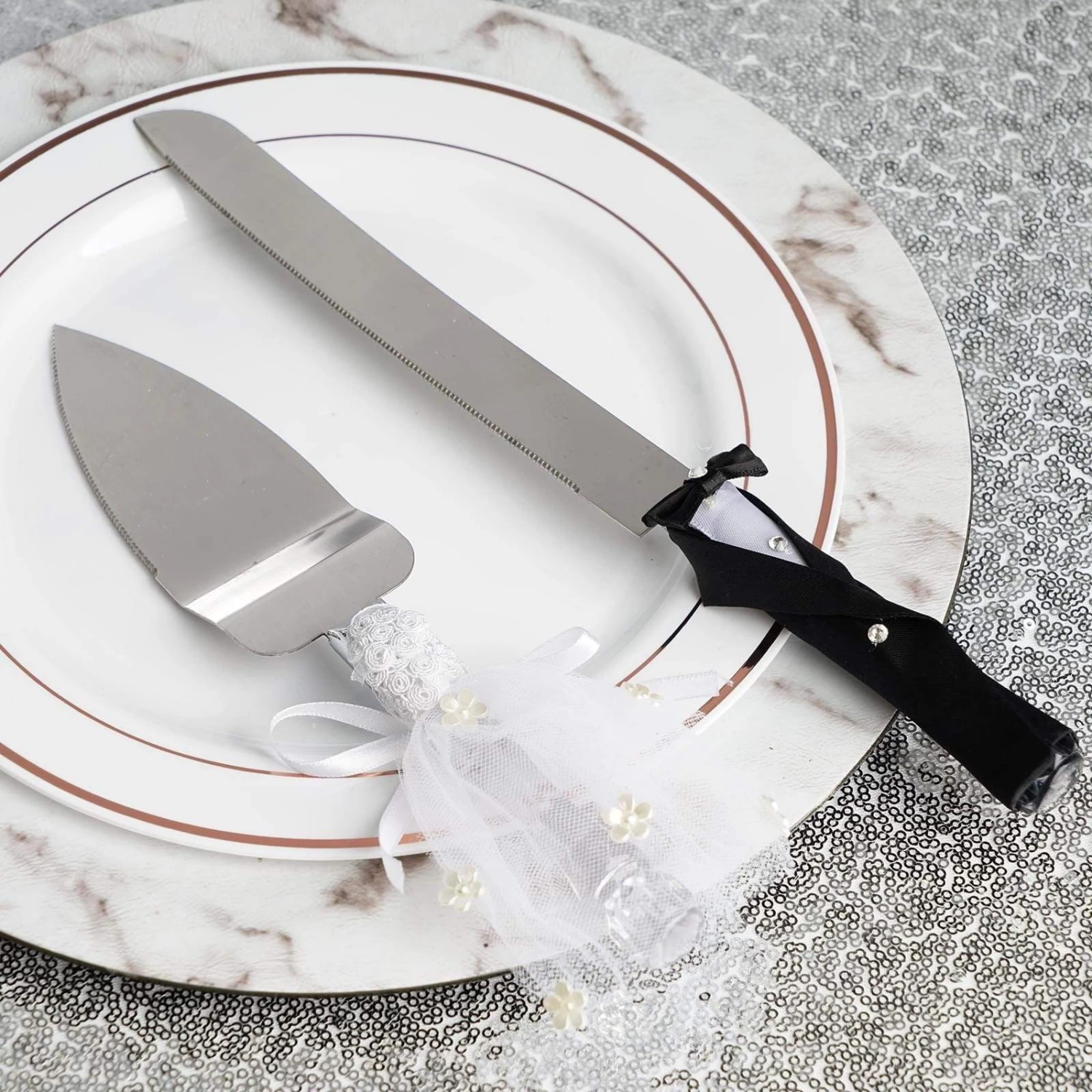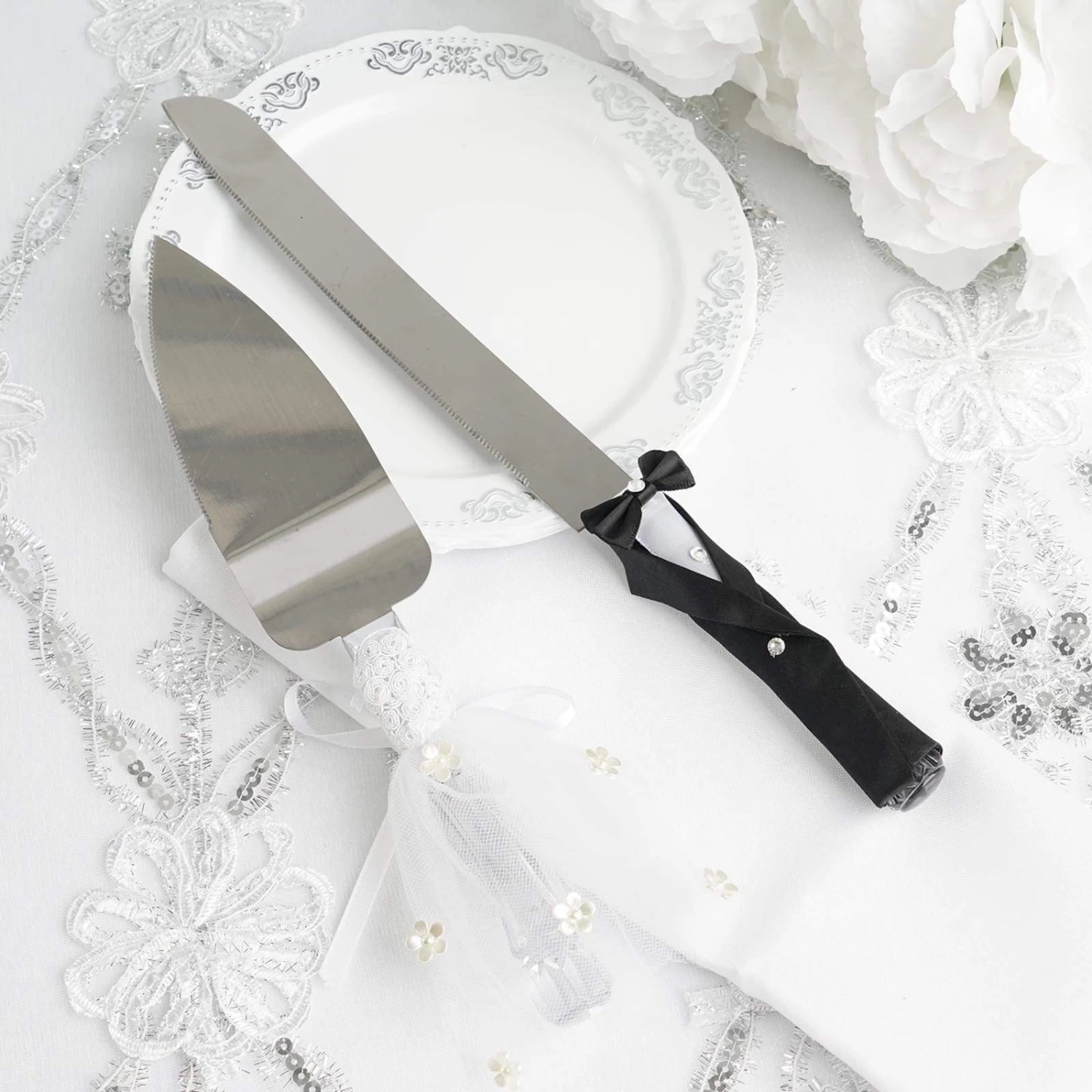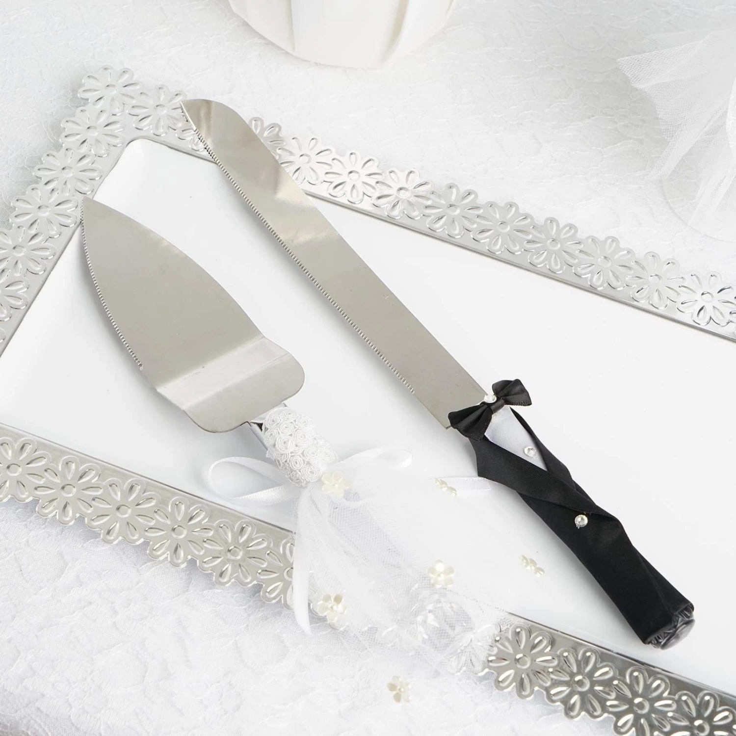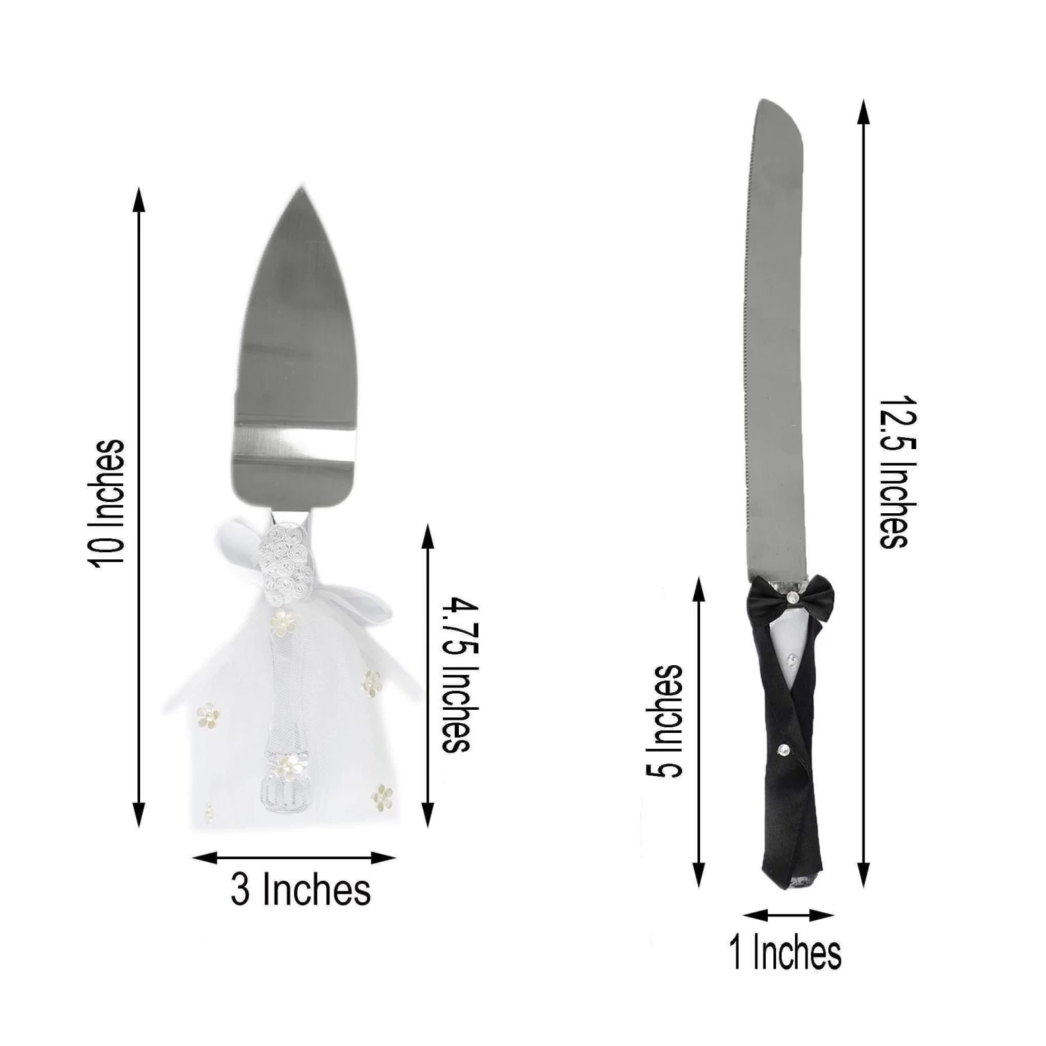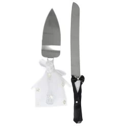 Let this knife and server set bring festive fun to your special occasion! Featuring handles with elegant and romantic design, this stainless cake serving set will last well into happily ever after. The cake knife with groom outfit is accented with sparkling rhinestones, while the server handle is covered by a bride-like dress with flower embellishments. Perfect gift for anniversaries, weddings, or any romantic occasions. Pair this set with your wine glasses, serving trays, cake toppers and other tabletop decors for an extra stylish look.