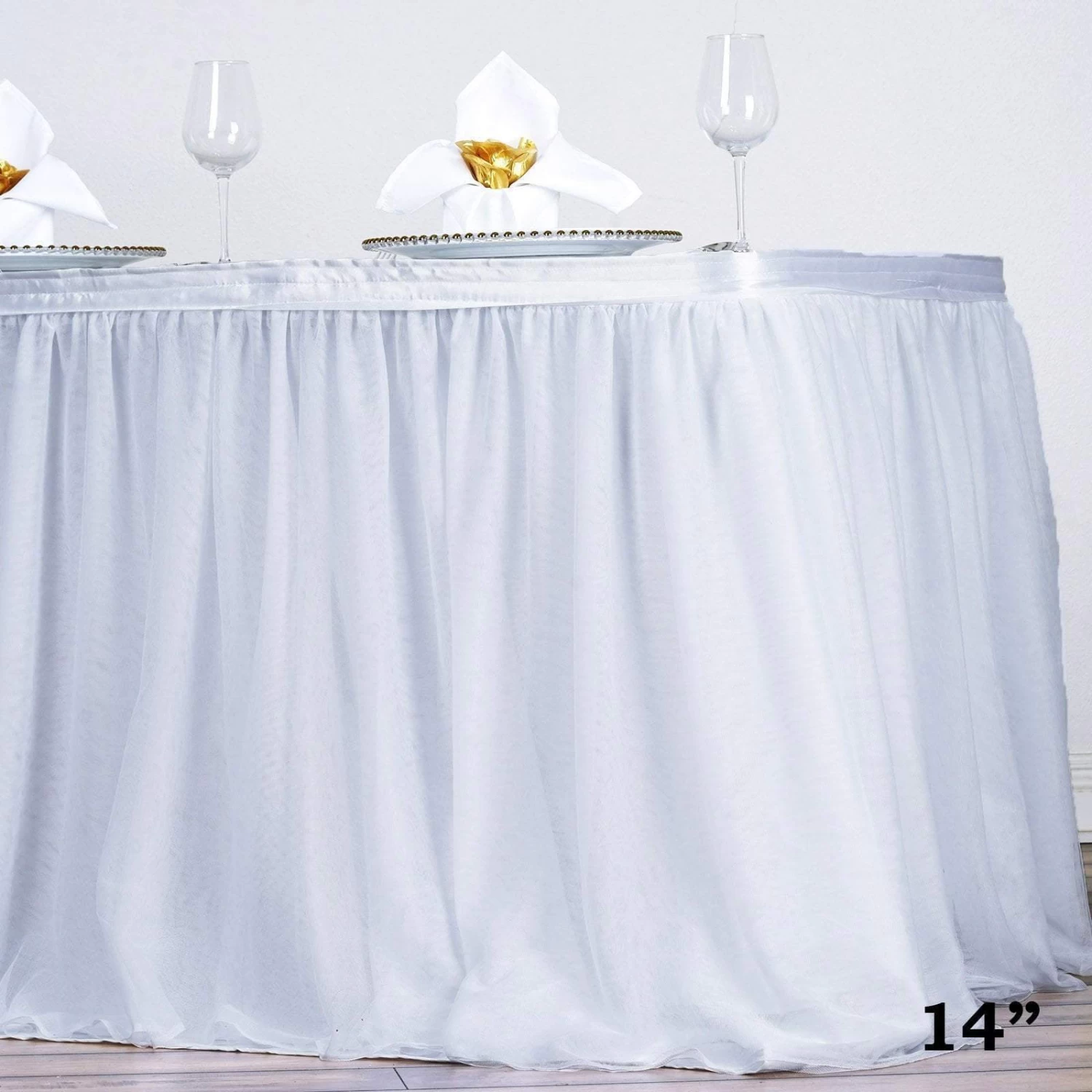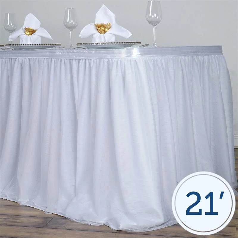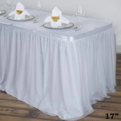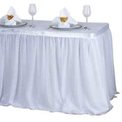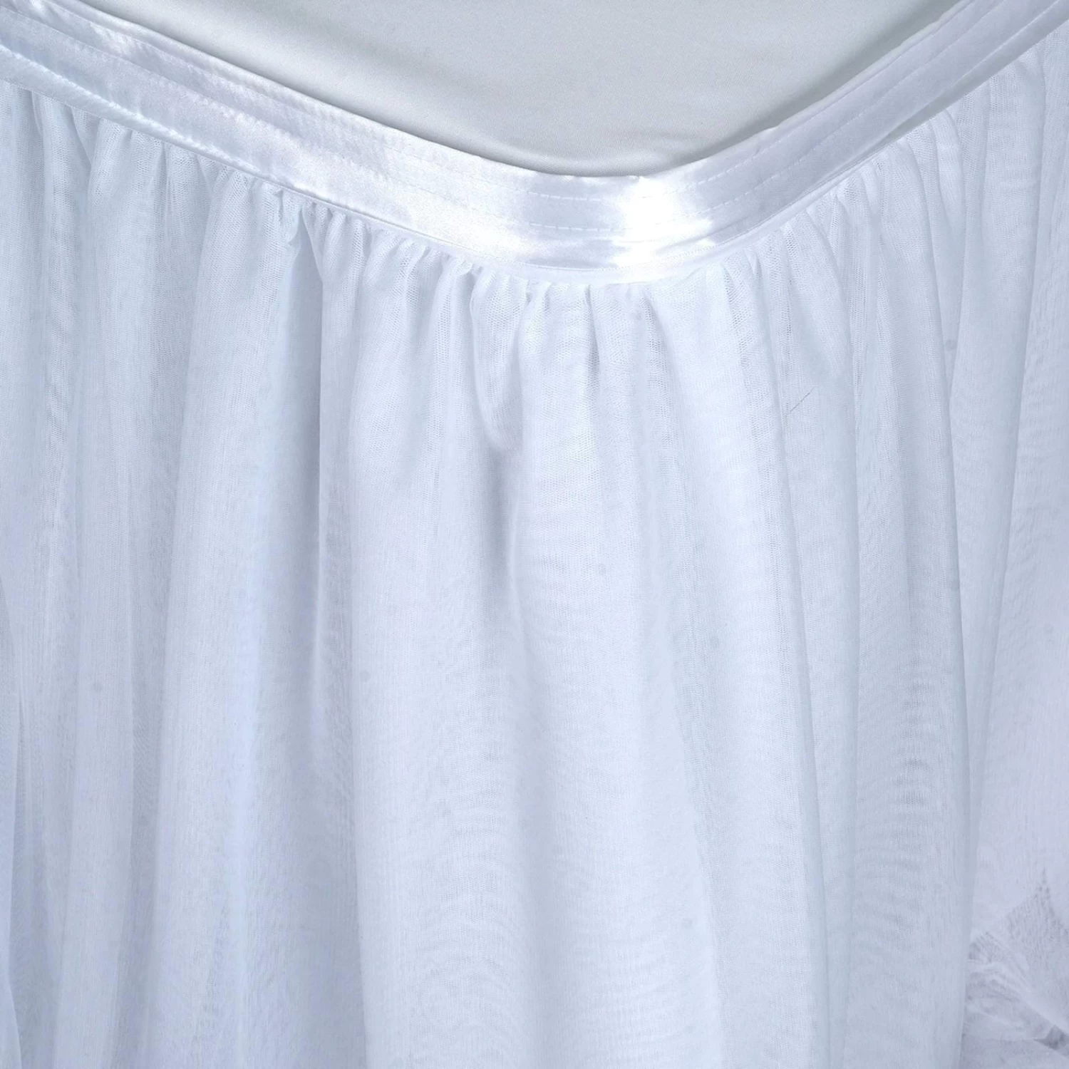 Celebrate your special day and set particularly welcoming tables for your wedding reception or party with these beautiful table skirts. Delightful extra full layers of tulle and the smooth, silky satin attachment up on top will give any celebration a sophisticated look. All table skirts come with velcro on top for attachment to clips so they could be easily attached to your tables.